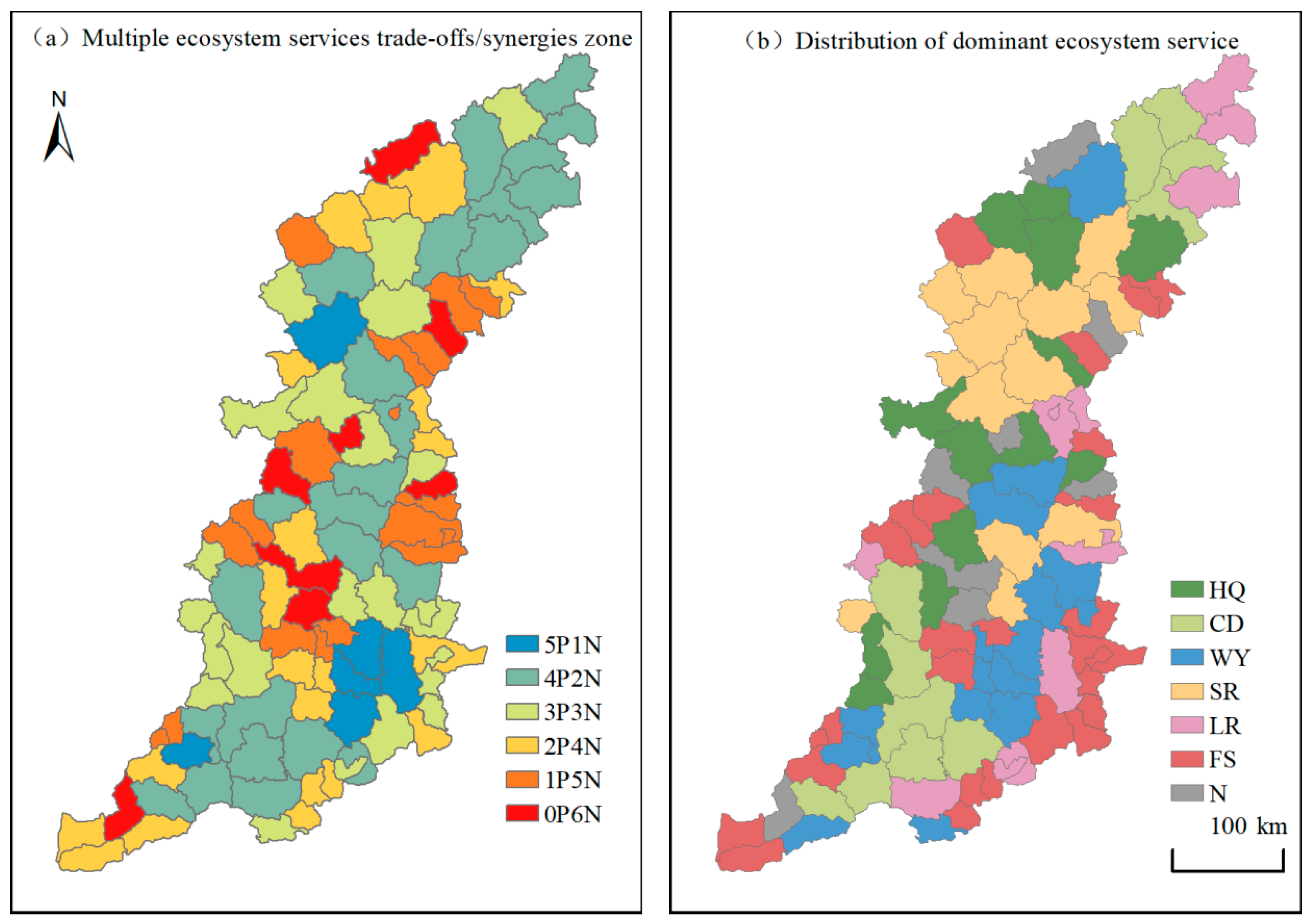 Figure 5a). The spatial distribution of dominant ecosystem services was determined by identifying the service with the maximum positive value in each unit, whereas units with exclusively negative values were classified as non-dominant (N) (