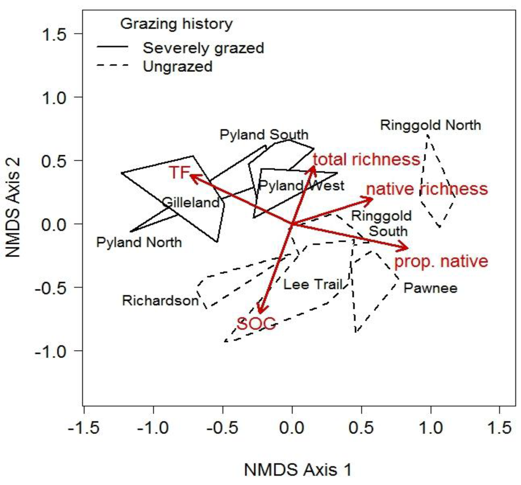 Ordination of plant species composition from 54 modified Whittaker plots (plots) by Nonmetric Multi-Dimensional Scaling (NMDS) of Canberra distances (k = 4, stress ≈ 12%). The ordination is based on 196 plant species abundance sampled from nine tracts in the Grand River Grasslands of south-central Iowa and north-central Missouri, USA. Plant communities are plotted by tract and grazing history. The six Whittaker plots of each tract are connected by minimum convex hulls in which unbroken lines denote tracts with a recent history of severe grazing, and broken lines denote tracts with no recent history of grazing. Arrows indicate vectors of increase along a gradient of variation within ordination space for each factor. Arrow length is proportional to the correlation between a variable and the NMDS axis closest to parallel with the vector. Vector abbreviations: TF = tall fescue abundance, prop. native = proportion of native species abundance, native rich = native species richness, total rich = total species richness, SOC = soil organic carbon.