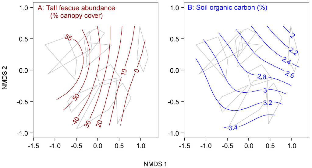 Fitted surfaces present gradients in tall fescue canopy cover (A) and soil organic carbon (B) across the ordination of vegetation data presented in Figure 1. Grey polygons connect six modified Whittaker sampling plots for each of nine sampled tracts.