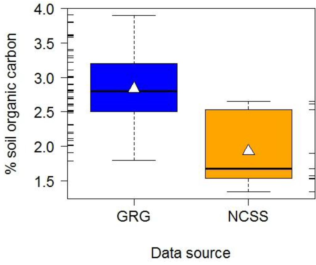 Box-and-whisker plot comparing soil organic carbon (SOC) in this study (Grand River Grasslands, GRG) to eight samples of cultivated soils (six Armstrong soil samples and two Gara soil samples) reported online by the National Cooperative Soil Survey [33]. Tick-marks just inside the left and right axes denote the distribution of individual samples for the GRG and NCSS, respectively. Open triangles denote means. All samples were 0 to 15-cm sampling depth.