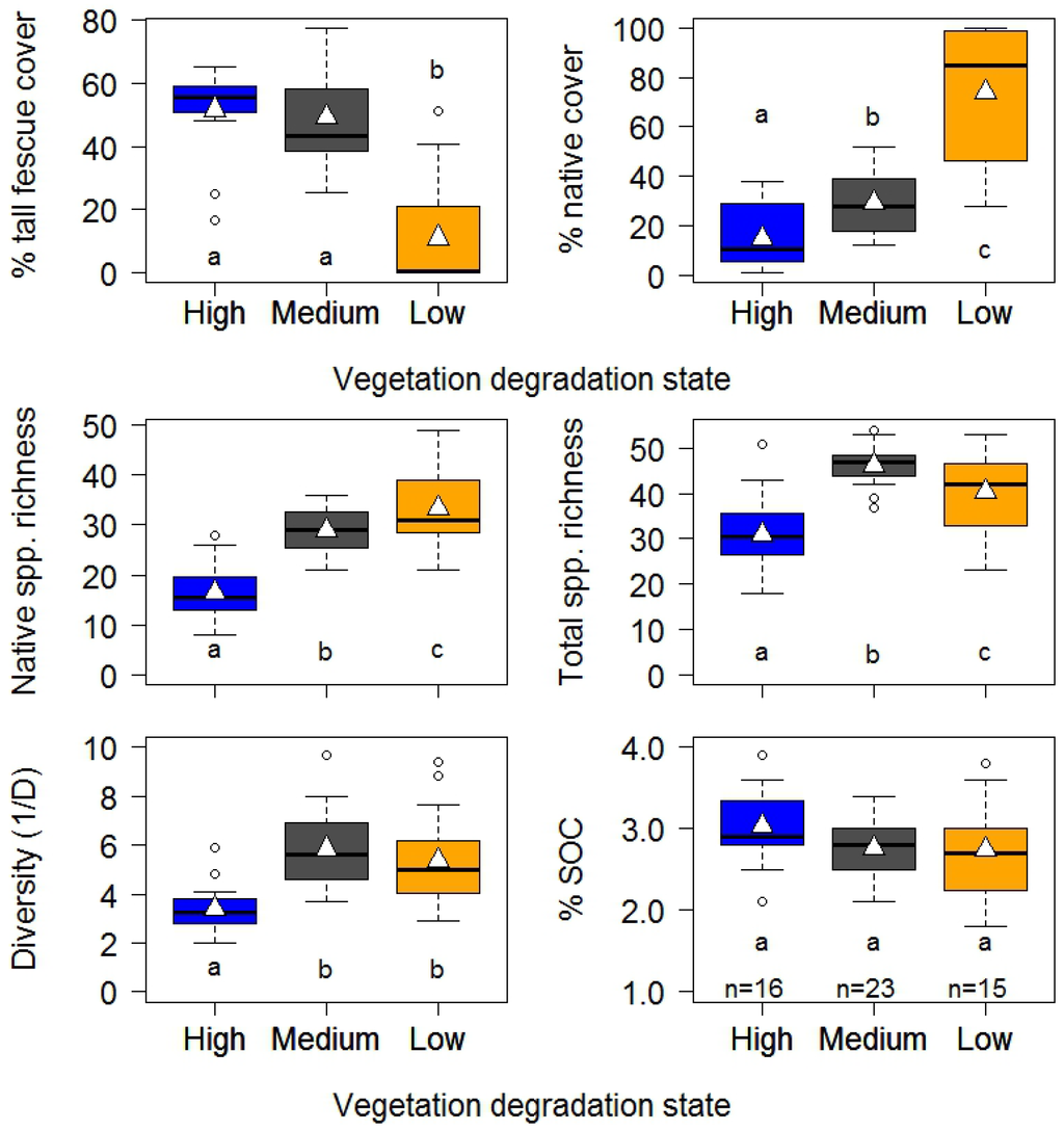 Box plots of six factors associated with degradation plotted by vegetation degradation states. Overlap among states and outliers suggest individual modified Whittaker plots in transition between states. Boxes include the first and third quartiles; horizontal lines denote data median and open triangles denote data mean. Whiskers extend to one interquartile and outliers are denoted as open circles. Letters indicate statistical difference (p ≤ 0.05) between means in pairwise t-tests.