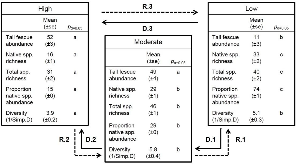 We predicted that patterns of plant community composition (i.e., vegetation states) correspond to patterns in three factors of degradation: tall fescue abundance, grazing history and soil organic carbon. To inform restoration action, we use a state-and-transition framework [31,32] to discuss potential degradation and restoration pathways with respect to conservation in working grassland landscapes.