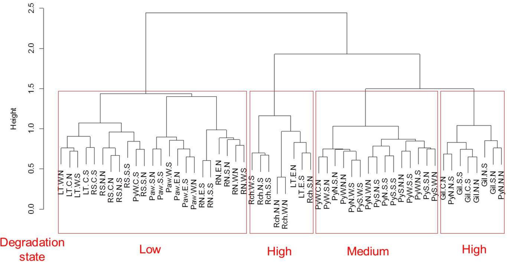 Results of hierarchical clustering using the Canberra distance matrix to identify three vegetation states based on plant community composition (see Experimental section in main text). Codes represent each of 54 modified Whittaker plots used for vegetation sampling (see Table A1 for explanation of nomenclature and description of plant community attributes). The two High degradation groups are combined into a single vegetation state based on similarity of plant community attributes listed in Table A1 (see Experimental section in main text).