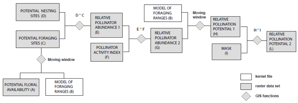 Flow chart outlining the setup of the pollination model which results in the calculation of the relative pollination potential.