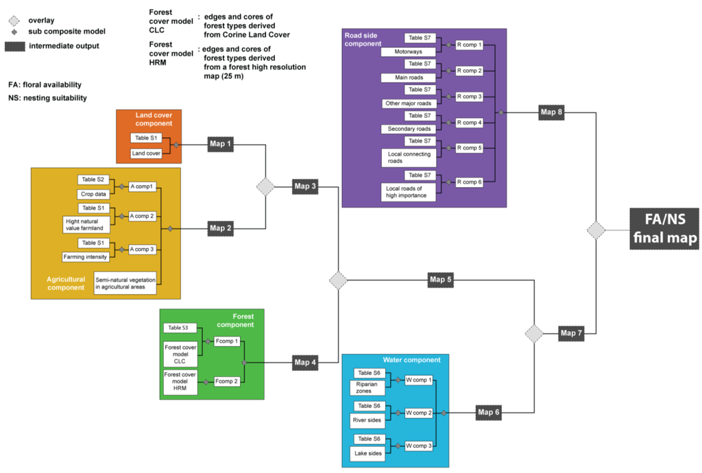 Figure 2 presents a flowchart showing how both composite indicators were derived using several spatial datasets while several tables of the Supplement to this article provide the scores between 0 and 1 assigned to different land cover and land use types with respect to nesting suitability and floral availability.