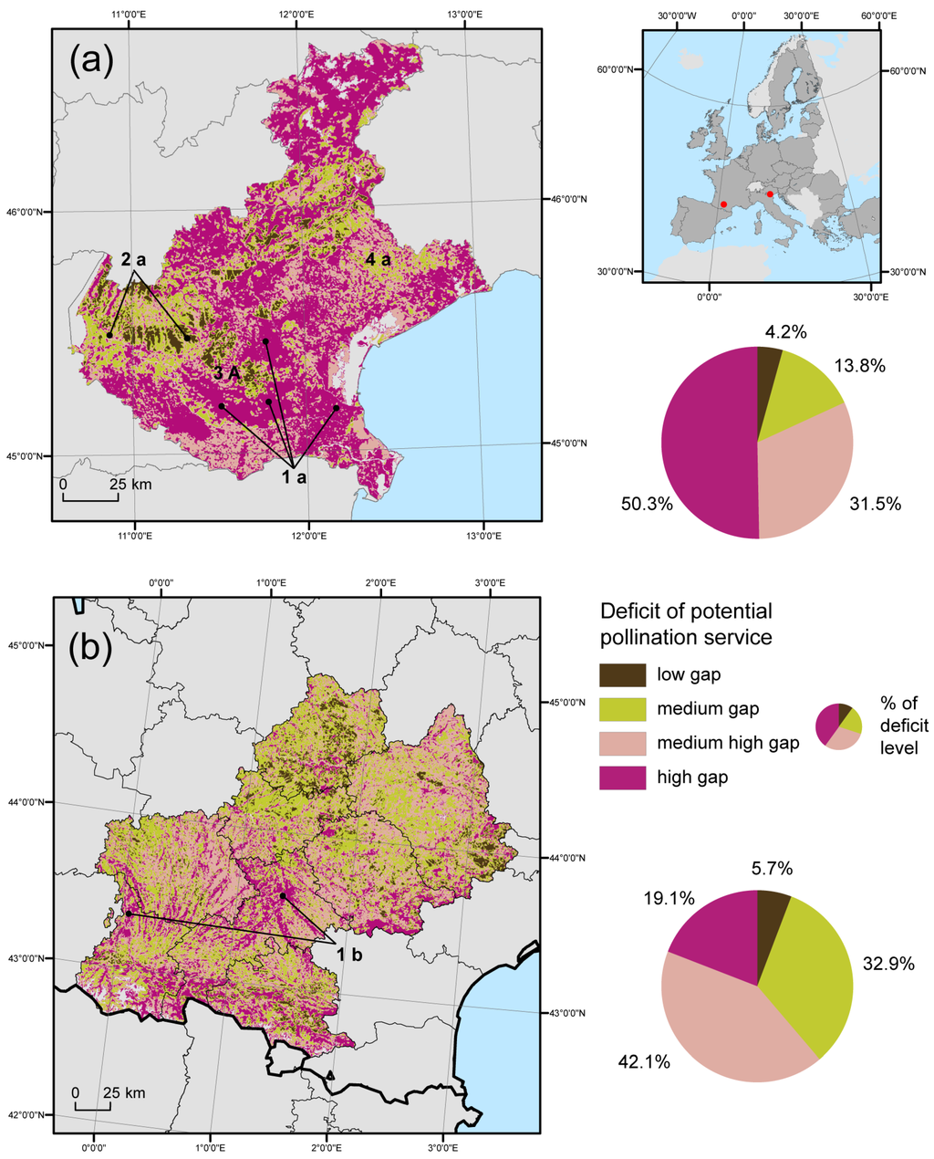 Pollination deficit for two regions in Europe. (a) Veneto northeast Italy; (b) Midi-Pyrénées, southern France). Color codes on the map correspond with areas of low, medium, medium to high and high gaps in the potential supply of pollination. Pie charts present the relative share of each gap for the entire region. See text for explanation of the codes on the maps.