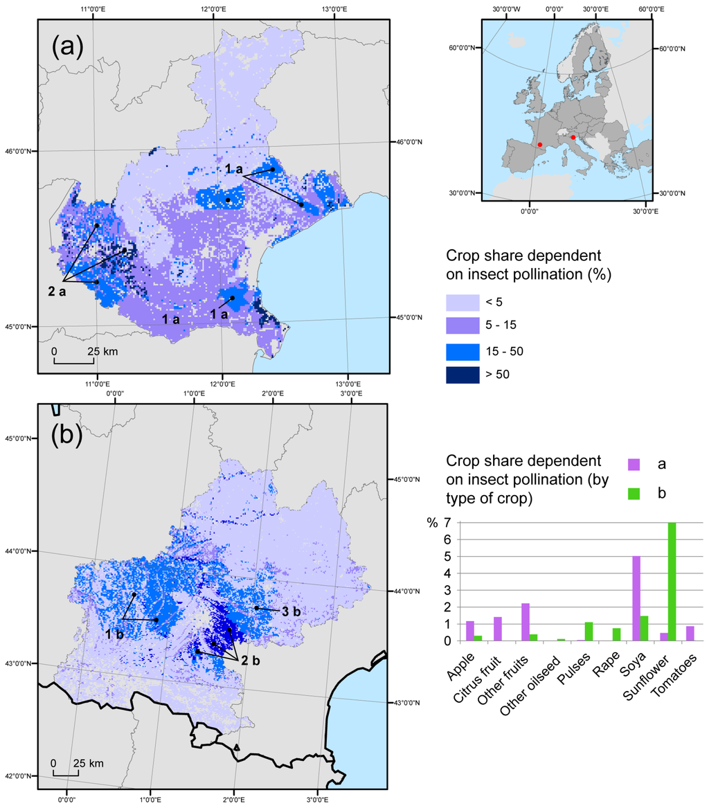 Crop share (%) dependent on insect pollination: (a) Veneto northeast Italy; (b) Midi-Pyrénées, southern France).
