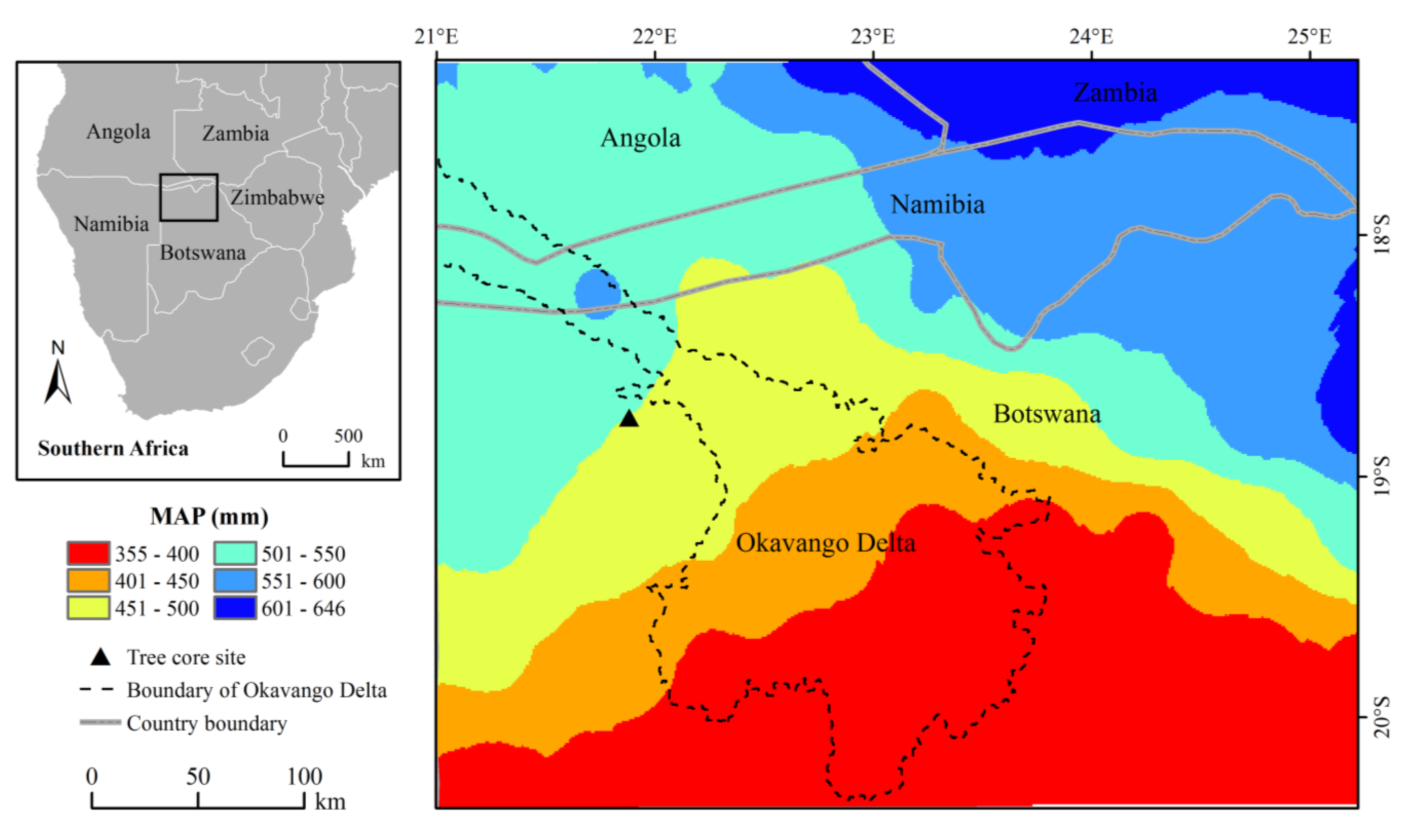 The Okavango catchment (Figure 1) ranges in size from 3,000 to 16,000 km2 dependent upon precipitation and inundation patterns. Our study area is focused on the southern portion of this much larger basin, an area with relatively low population density, and away from river inundation and flooding, such that the only moisture input to the trees we study is local precipitation. This semi-arid region is defined by scarce annual precipitation and high interannual variability (coefficient of variation), and experiences mean annual precipitation (MAP) between 350 and 650 mm/yr [35,36,37]. Kalahari sands constitute the dominant soils throughout. The inception of a period of reduced precipitation in the late 1970s correlates to a noted shift in global climate and decreased precipitation over much of southern Africa, possibly in connection to a coupling of the El Niño-Southern Oscillation (ENSO) and the Indian Ocean Di-pole [38,39,40,41,42].