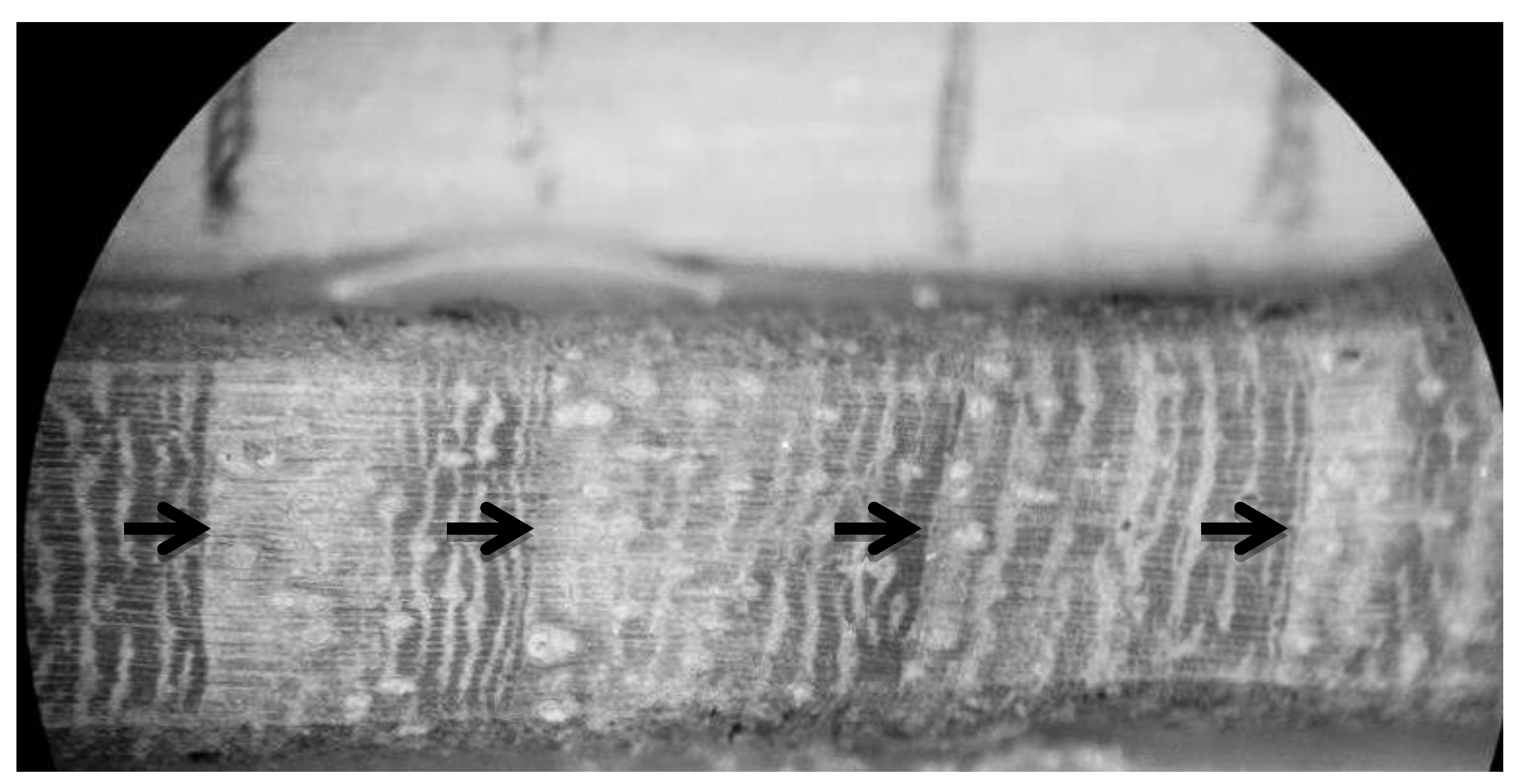Ring structure of Pterocarpus angolensis (stereo-zoom microscope). Arrows illustrate the clarity of the tree rings and direction of growth.