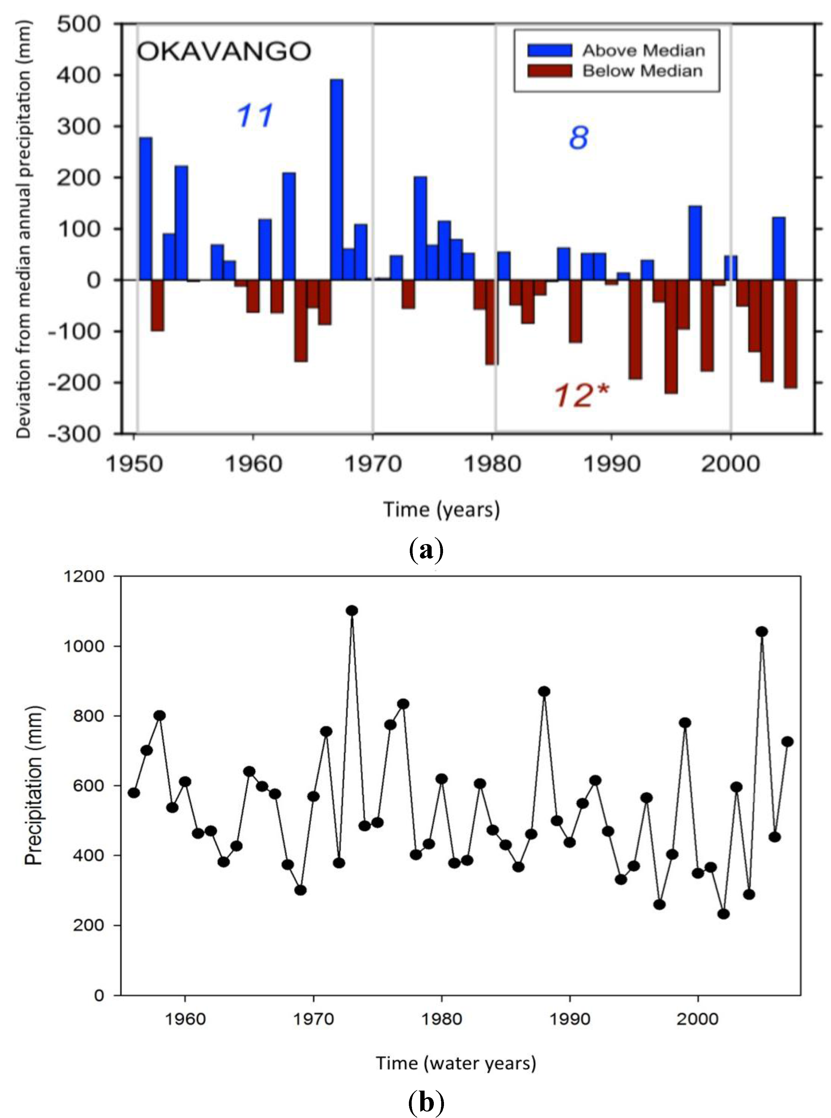 Annual precipitation for (a) Deviations from the 1951–2005 median annual precipitation for the Okavango drainage basin overall, and (b) Shakawe station precipitation data from 1951 to 2005.