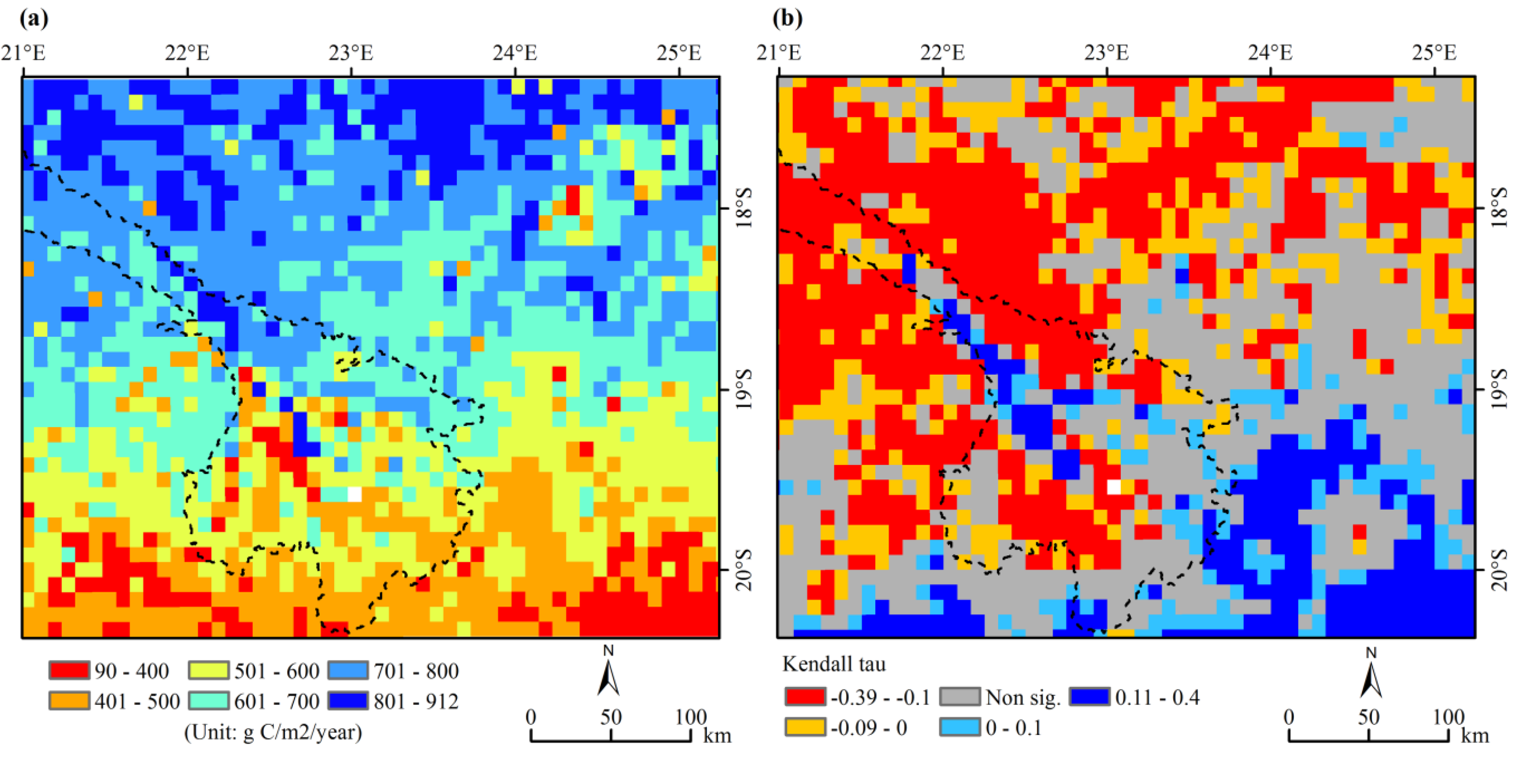 Within the study area (Figure 7), we see a decline in NPP as we move south, that is strongly associated with precipitation (Figure 1). Given this is a water limited savanna system this pattern is expected. In terms of changes in NPP across the study period 1982–2010, we can see that while overall patterns show a significant decline in NPP (Figure 7b) there is also a region in the southernmost region, where precipitation totals around 450–550 annually or within the actual Delta area in the Okavango, where NPP values have increased across this time period. In terms of linking to our tree ring data, our region where our trees were cored (Figure 1) falls into the decreasing trends of NPP and higher MAP. As such these patterns do match the tree rings in terms of decreasing growth. Along with the declines in precipitation values (Figure 4) across this region for the same time period, we can hypothesize with some degree of certainty that decreasing precipitation has resulted in decreased tree growth and more regionally, NPP values overall.