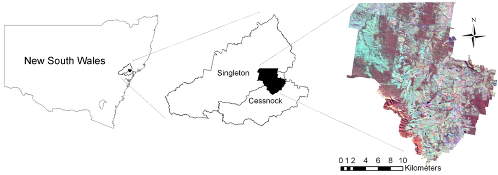 Additionally, appropriate high-resolution orthorectified aerial photographs—acquired sometimes between 2004 and 2006—were procured from a company called Plateau Images, Alstonville, New South Wales Australia. These photographs were of high spatial resolution of approximately 0.35m within the Cessnock photo tile and 1 m for all other tiles. Also, the following data were procured from two government sources: black and white aerial photographs acquired in 1984, colour aerial photographs acquired between 1976 and 1977, in 1991, 1998 and 2000 (from the New South Wales Department of Land), and the Singleton Land Use Geodatabase (currency: 2000–2007) and digital elevation model (DEM) (from then Department of Natural Resources, now renamed as Department of Environment, Climate Change and Water, New South Wales Government). The aerial 1:25,000 scale aerial photographs that were procured from the Department of Land were at the orthorectified using the above-mentioned already orthorectified aerial photographs (procured from Plateau Images acquired in 2004 to 2006). The aerial photographs for each period were mosaicked and transformed to projected coordinate system using ERDAS Imagine Ver. 8 [20]. Then all of the orthorectified aerial photographs were re-sampled to 2 m spatial resolution. While the photographs were mainly used as reference data, the Singleton land use geodatabase and DEM were utilized as ancillary data for the knowledge-based post-classification correction.