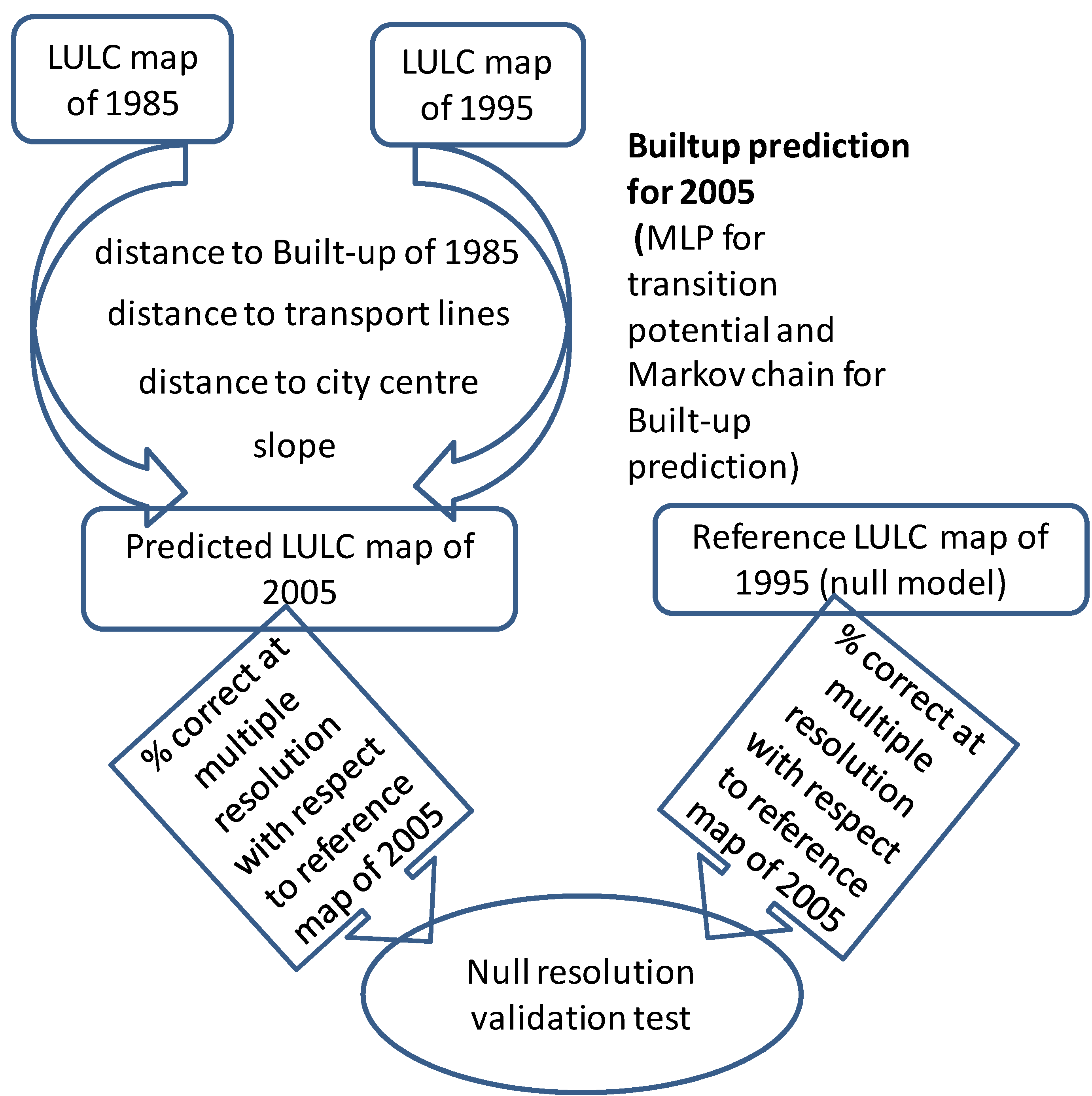 To test the performance of the simulated model, the following steps were performed (Figure 2): (i) percent correct at multiples of base resolution at geometric sequence was determined for the simulated map of 2005 with respect to the reference map of 2005 using a validate module of IDRISI Andes [21]. (ii) percent correct at multiples of base resolution at geometric sequence was determined for the null model map (reference map of 1995) with respect to the reference map of 2005 in the same way; (iii) the results of the two comparisons were plotted against the multiple resolutions to see a null resolution, i.e., to determine if the resolution at which the accuracy of predictive model is equal to the accuracy of the Null model.