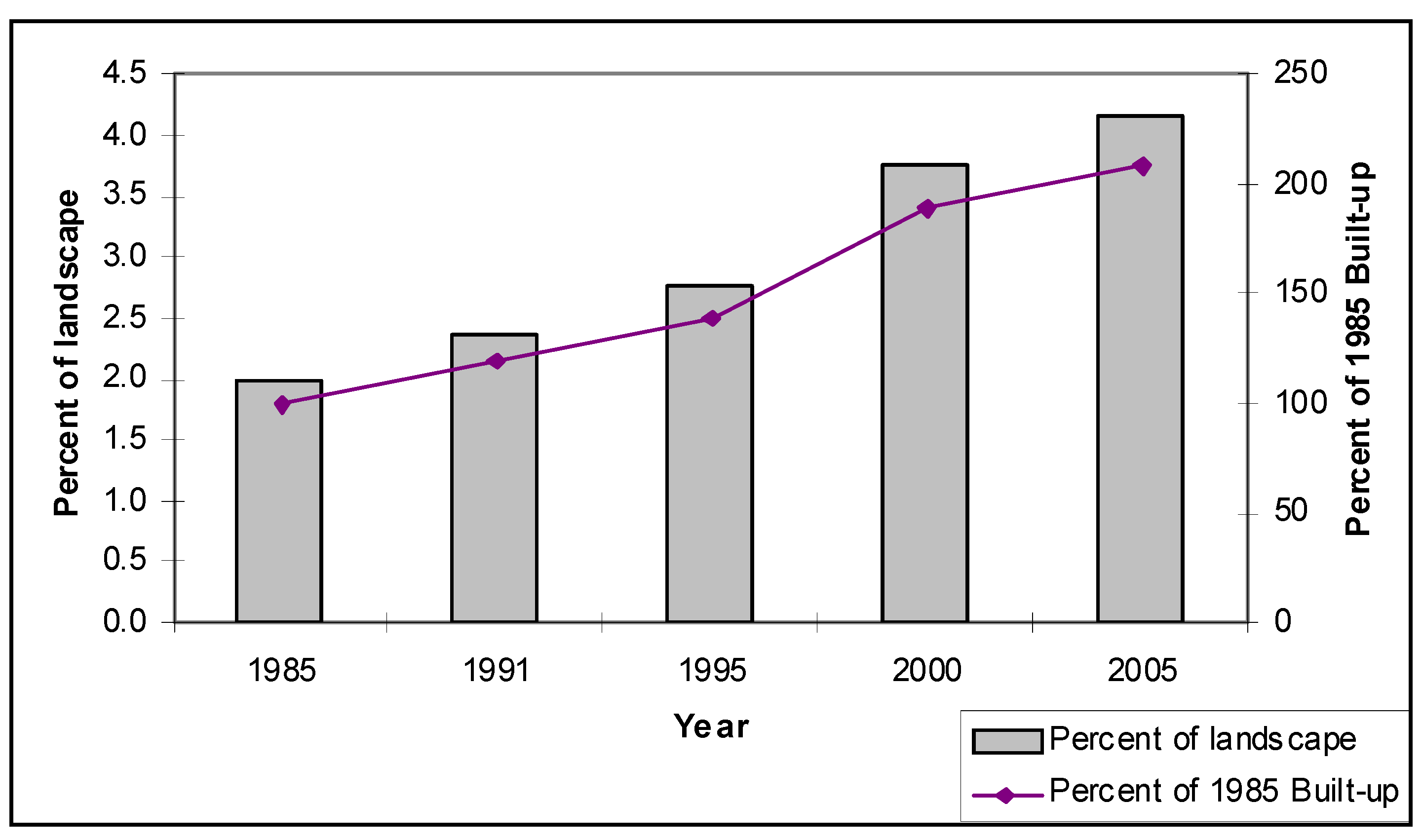 Built-up land was found to be 2% of the landscape in 1985 and then increased to 2.4%, 2.8%, 3.8% and 4.2% by the years 1991, 1995, 2000, and 2005, respectively. Thus, built-up areas had increased to more than double by 2005 in comparison to that of 1985 (Figure 3).