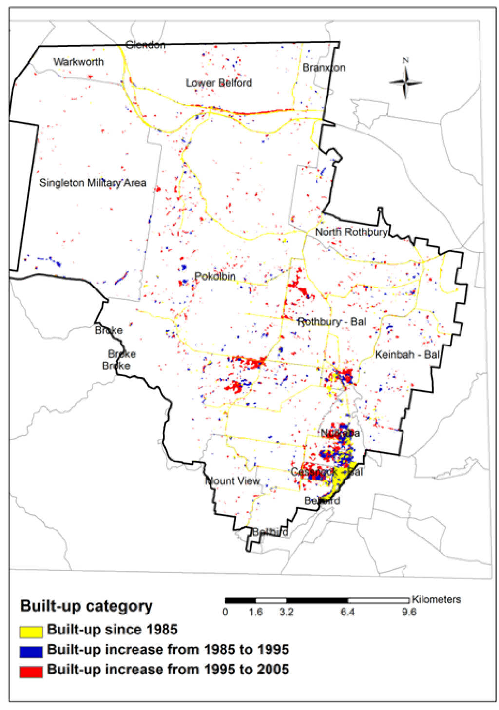 In overlaying the built-up layers of 1985, 1995 and 2005 on the suburb map (Figure 4), the expansion of built-up areas was observed to be mainly in the outskirts of the 1985 build-up and along the road corridors in the suburbs of Cessnock-Bal, Pokolbin, Nulkaba and Rothbury-Bal. Bigger patches of increased Built-up after 1995 in Pokolbin and Rothbury-Bal are associated with the large-scale hotel and resort developments in the area.