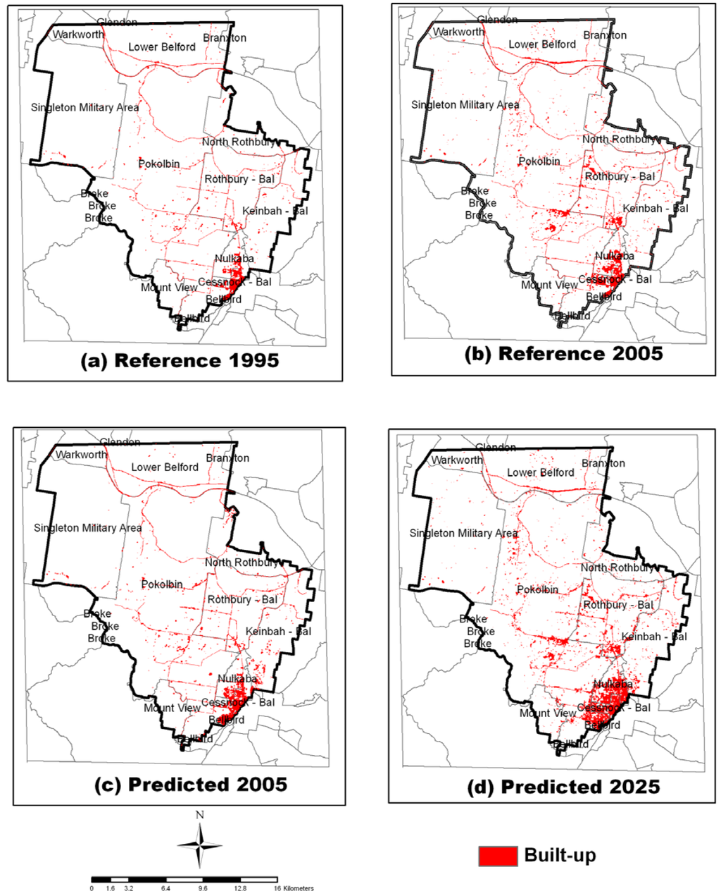 The reference maps of 1995 and 2005 along with the result of the prediction to 2005 and 2025 are shown in Figure 5. When the predicted map of 2005 was compared with the reference map of 2005 (Figure 5b), the area of Built-up observed in the middle of Pokolbin and south-east corner of Rothbury (as seen in the reference map) were found to be absent in the predicted map (Figure 5c). This shows the limit of LULC prediction based on historical information alone, as there could have been various other factors such as policy intervention and other events influencing the change. Though the prediction did not conform fully to the reality, this modeling has predicted a business-as-usual scenario (i.e., a scenario showing if the pattern of the development remains same as that of calibration period).