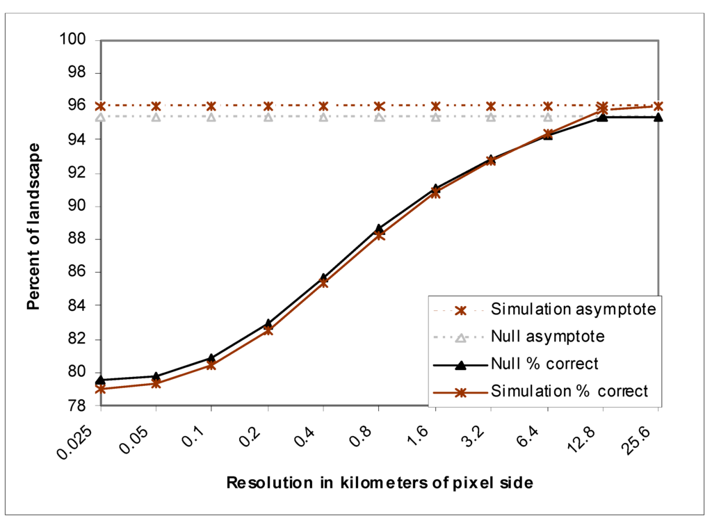When the percent correct of simulation model was compared with the percent correct of the null model at multiples of base resolutions (Figure 6), it was found that the null resolution of simulation model is at 3.2 km pixel side, meaning that the predictive model is more accurate than the null model at resolution coarser than 3.2 km resolution, while less accurate than null model at resolution finer than 3.2 km pixel side. The accuracy of the model is not particularly good, however when compared with other models of this type in the literature such as Pontius et al. [31], this can be considered as an average in level of accuracy.
