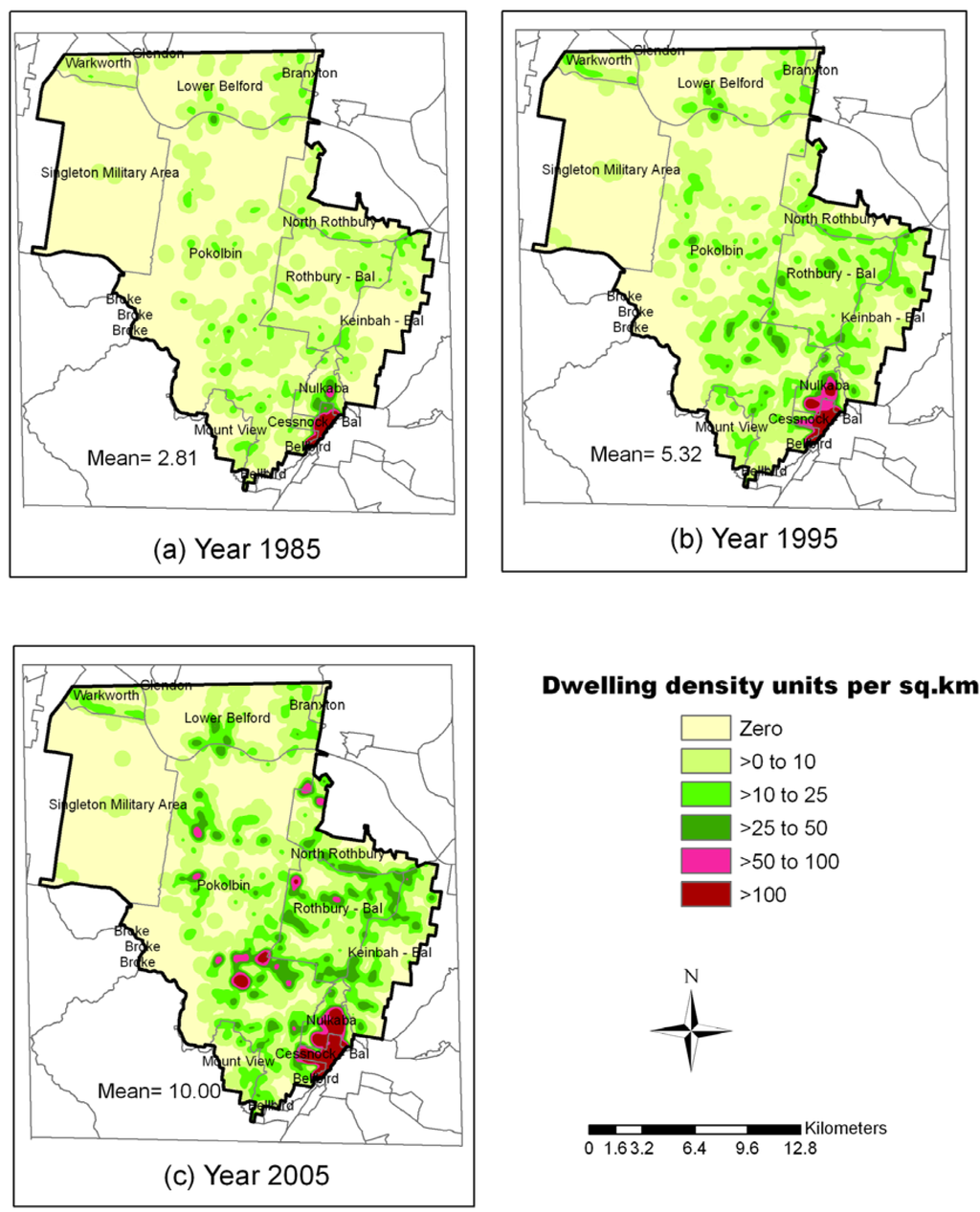 Overall the proportion of areas of between zero to 10 unit/km2 declined from 95% in 1985 to 86% in 1995 and then to 76% 2005 (Table 2). In contrast, the proportion of the landscape characterized by more than 10 units/km2 increased commensurately from 5% in 1985 to 14% in 1995 and 24% in 2005. Moreover, the proportion of the landscape that exhibited dwelling density greater than 50 units/km2 was 0.6% in 1985 increasing to 1.3% and 2.9% in 1995 and 2005 respectively. This increase in density is probably due to increase in wine-tourism activities, especially in the southern half of the study area in Cessnock LGA (Figure 7).