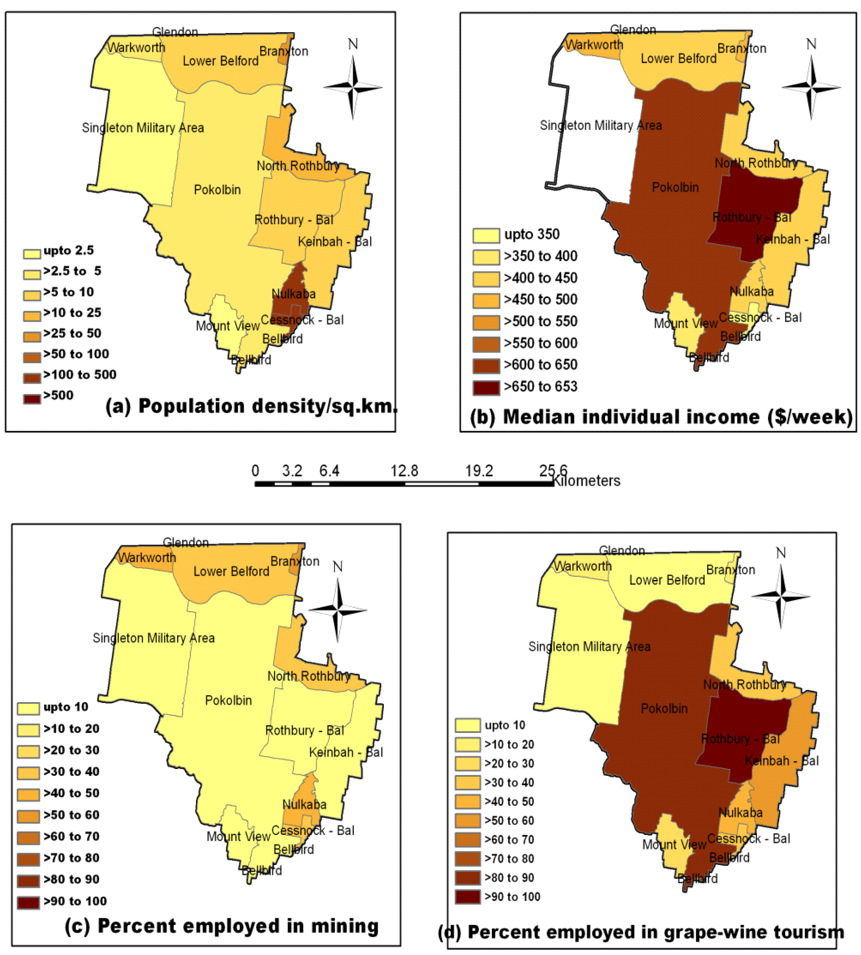 Economic information across the suburbs in the study region: (a) population density/km2, (b) median individual income $/week, (c) percent employed in mining and (d) percent employed in grape-wine tourism (Derived from ABS [33]).
