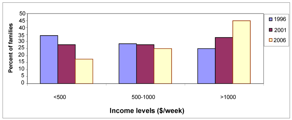 A temporal comparison of the level of income of families in Cessnock LGA in 1996, 2001 and 2006, reveals a clearly increasing trend of income (Figure 9). In 1996, 34% of the families earned less than $500/week and only 25% of families were earning more than $1,000/week. By the year 2006, only 18% families had earned $500/week, but 45% families earned more than $1,000/week. This would be a little less if inflation rate had been considered, i.e., $1 in 1996 is equivalent to $1.12 in 2001 and $1.29 in 2006 [34].