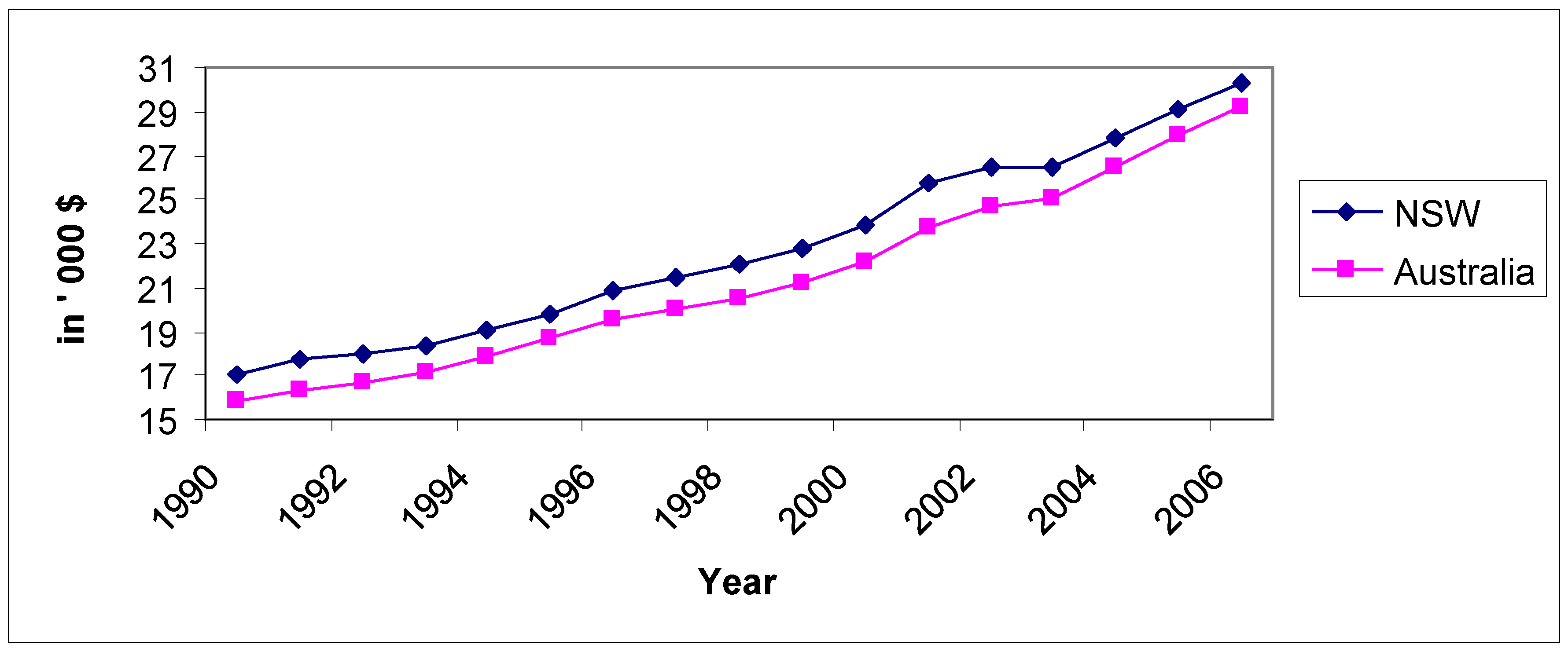 The tourism industry has been steadily growing in Australia. One of the main reasons is the strong economic growth that the country has experienced. Figure 10 shows steady increase of disposable household income per capita over the 16 years from 1990 to 2006 in NSW and in Australia. One can hypothesize that the higher the per capita income, the greater the expenditure on leisure and holidaying [36].