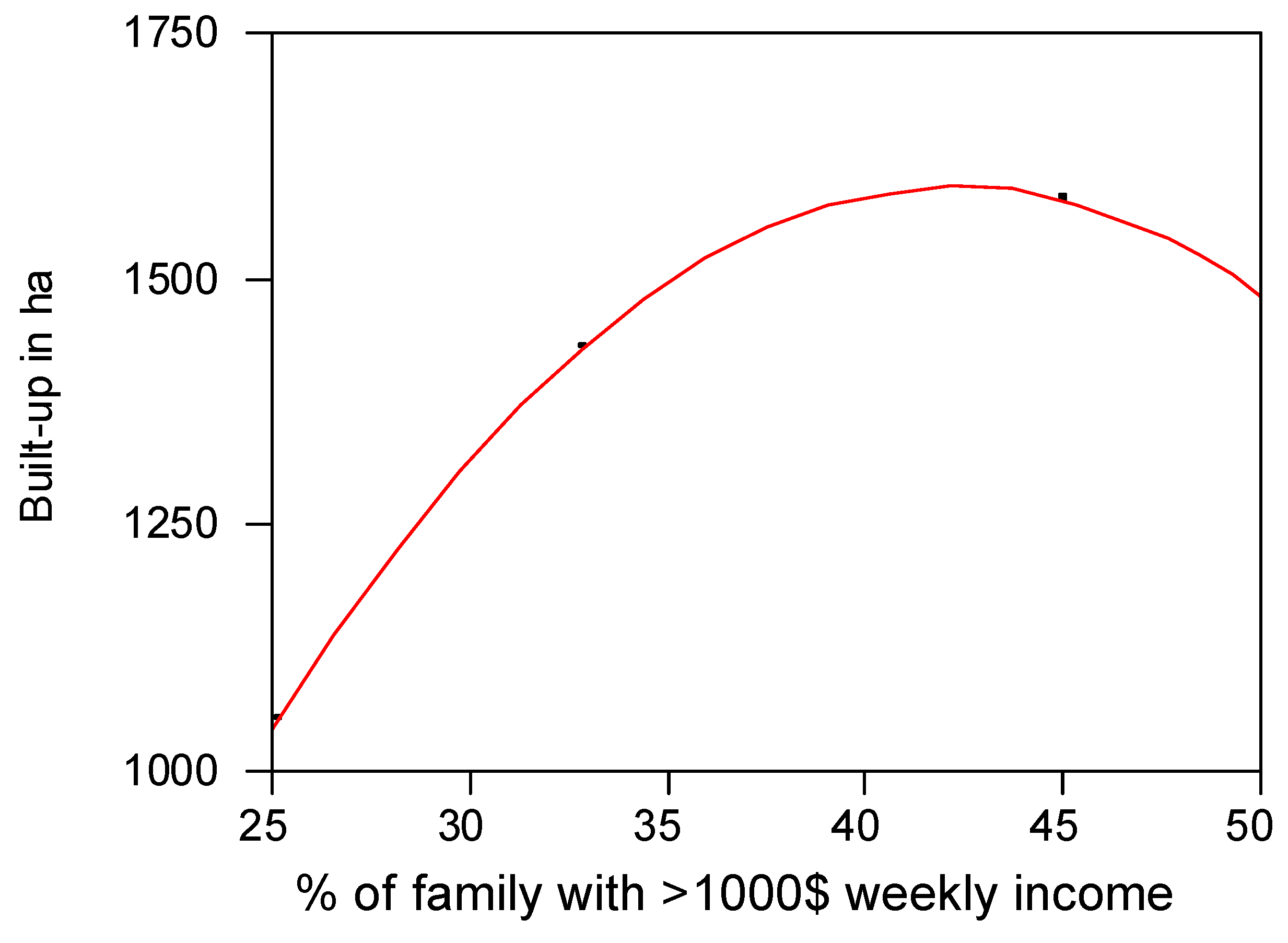 Although Built-up growth may be associated with the growth of the local economy in terms of creation of employment and increased income levels, it may also be seen as having significant impact on the environment through its ecological footprints [2,4,5]. The Environmental Kuznets curve (EKC) hypothesis is a relatively recent concept in environmental economics [38,39] that encompasses some aspects of the relationships between economic development and environmental degradation. According to this hypothesis, environmental degradation increases with income in the initial stages of economic development, but the rate of this increase gradually slows down, and after reaching a turning point, environmental degradation decreases as income continues to rise. This hypothesis proposes an inverted U-shape relation between environmental degradation and per capita income. In the context of the present study, considering Built-up as the manifestation of environmental degradation, we could plot the EKC in terms of Built-up acreage against the proportion of families with more than $1000/week during 1995–1996 and 2005–2006 in Cessnock LGA. This is presented in Figure 11, where one can observe a continual increase in the Built-up within a range of between 25% and 40% (corresponding to the period 1995–2000) of families earning more than $1000/week. Acreage of Built-up starts to decline once the proportion of families on relatively high income goes beyond 40%–45% (corresponding to the period 2000–2005).