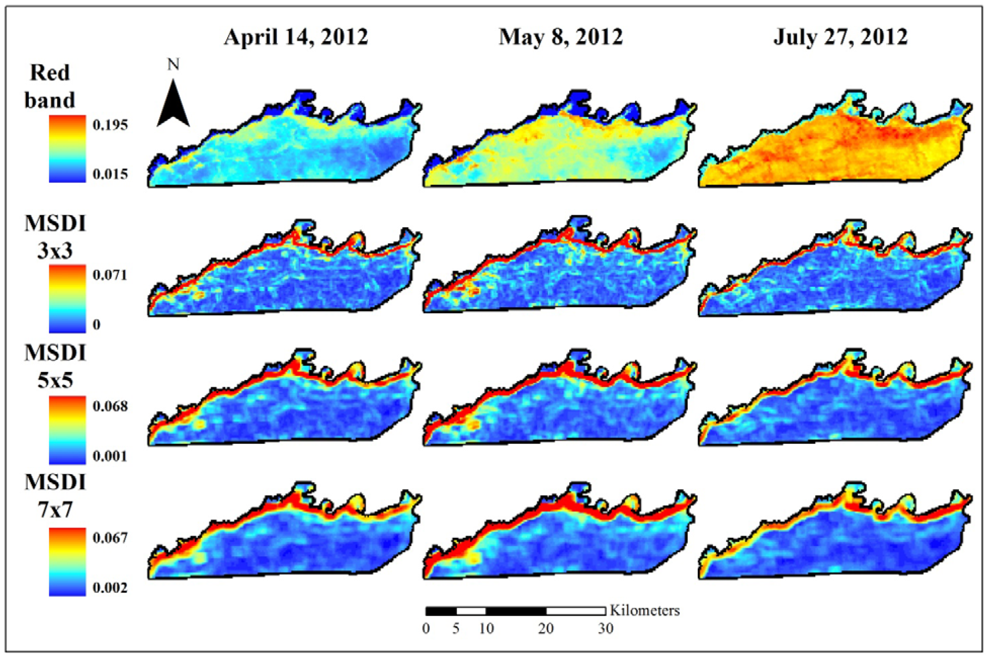 Red band MODIS data used to assess elephant utilization of vegetation along the Chobe riverfront, Chobe National Park, Botswana. The top row shows the base reflectance images for the three dates assessed in this project. Subsequent rows show the Moving Standard Deviation Index (MSDI) values calculated using 3 × 3-, 5 × 5-, and 7 × 7-pixel moving windows, respectively.