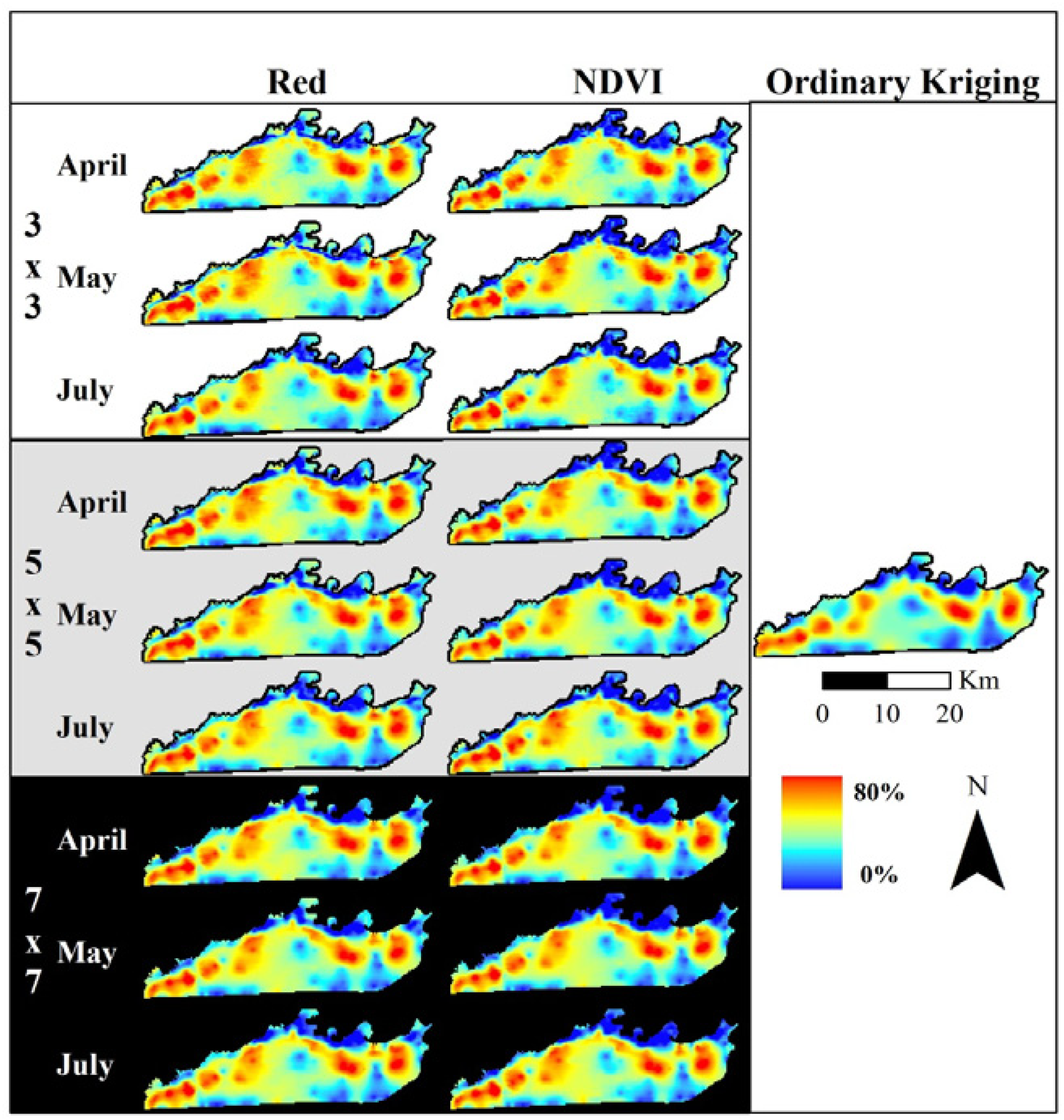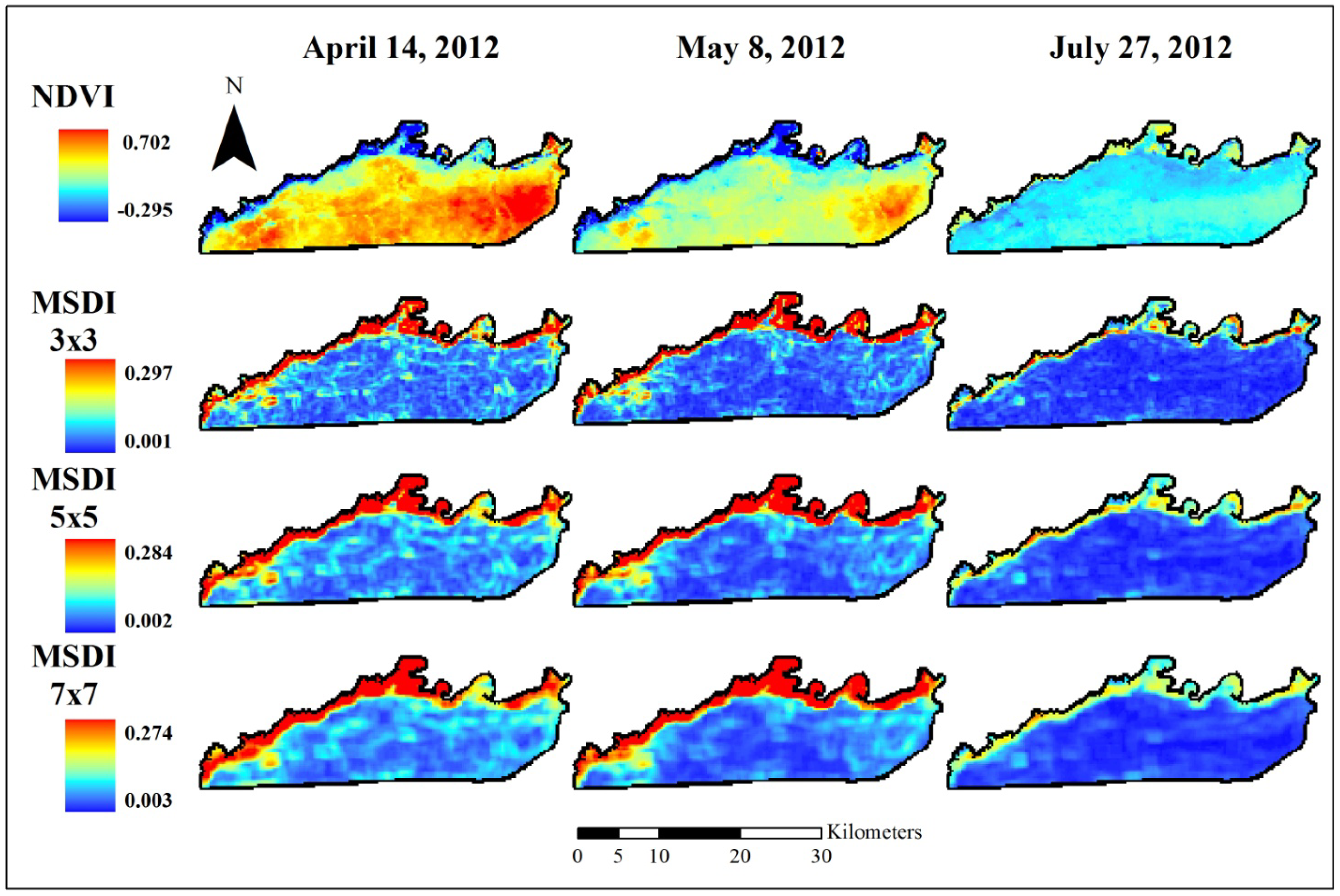 Normalized difference vegetation index (NDVI) data used to assess elephant utilization of vegetation along the Chobe riverfront, Chobe National Park, Botswana. The top row shows the base images for the three dates assessed in this project. Subsequent rows show the Moving Standard Deviation Index (MSDI) values calculated using 3 × 3-, 5 × 5-, and 7 × 7-pixel moving windows, respectively. These indices are unitless. NDVI ranges from −1 to +1 while the MSDI has a minimum value of zero and a maximum determined by the data.
