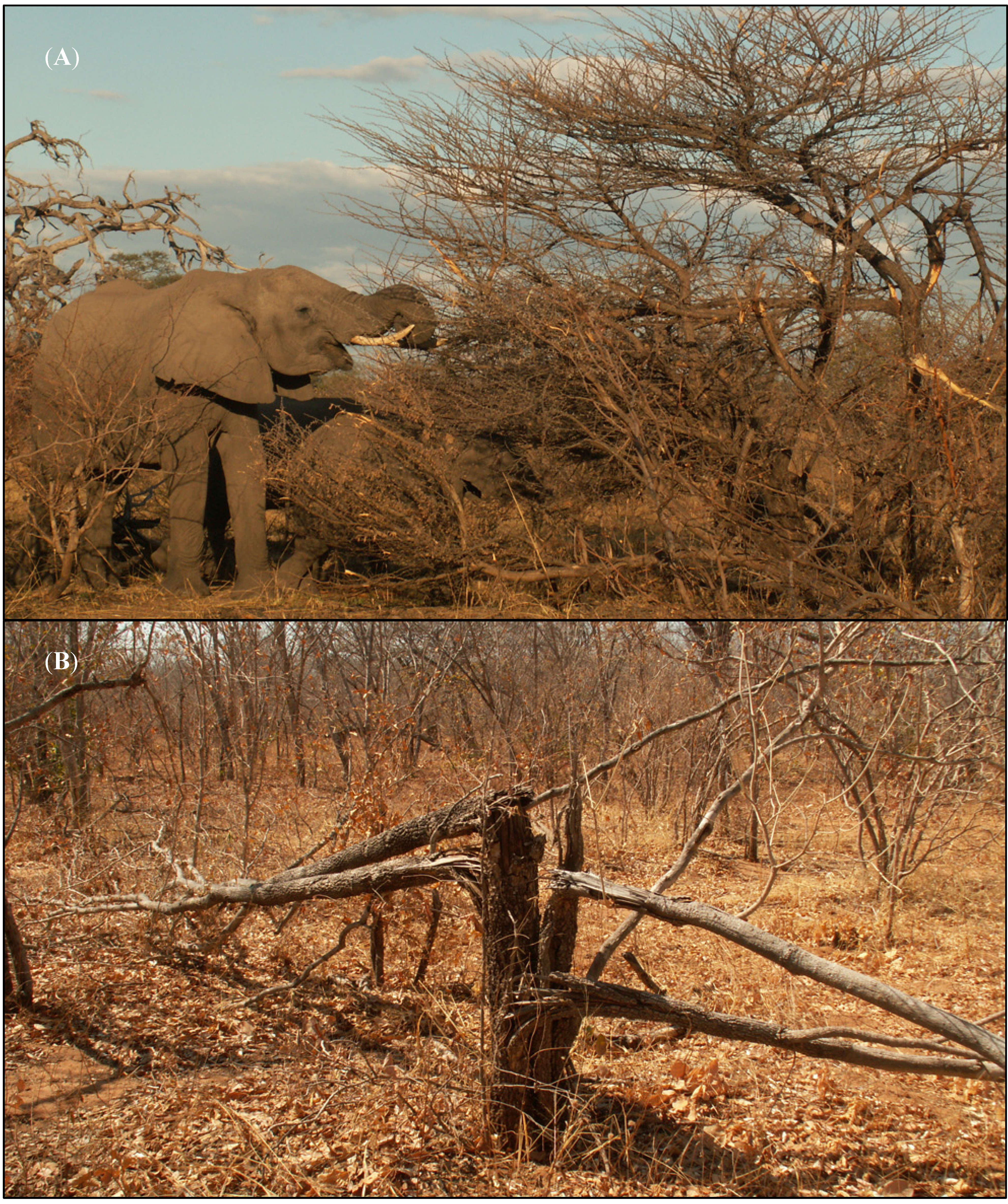 - Fullman, T.J. Spatial Dynamics of Elephant Impacts on Trees in Chobe National Park, Botswana. M.Sc. Thesis, University of Florida, Gainesville, FL, USA, 2009. [Google Scholar]