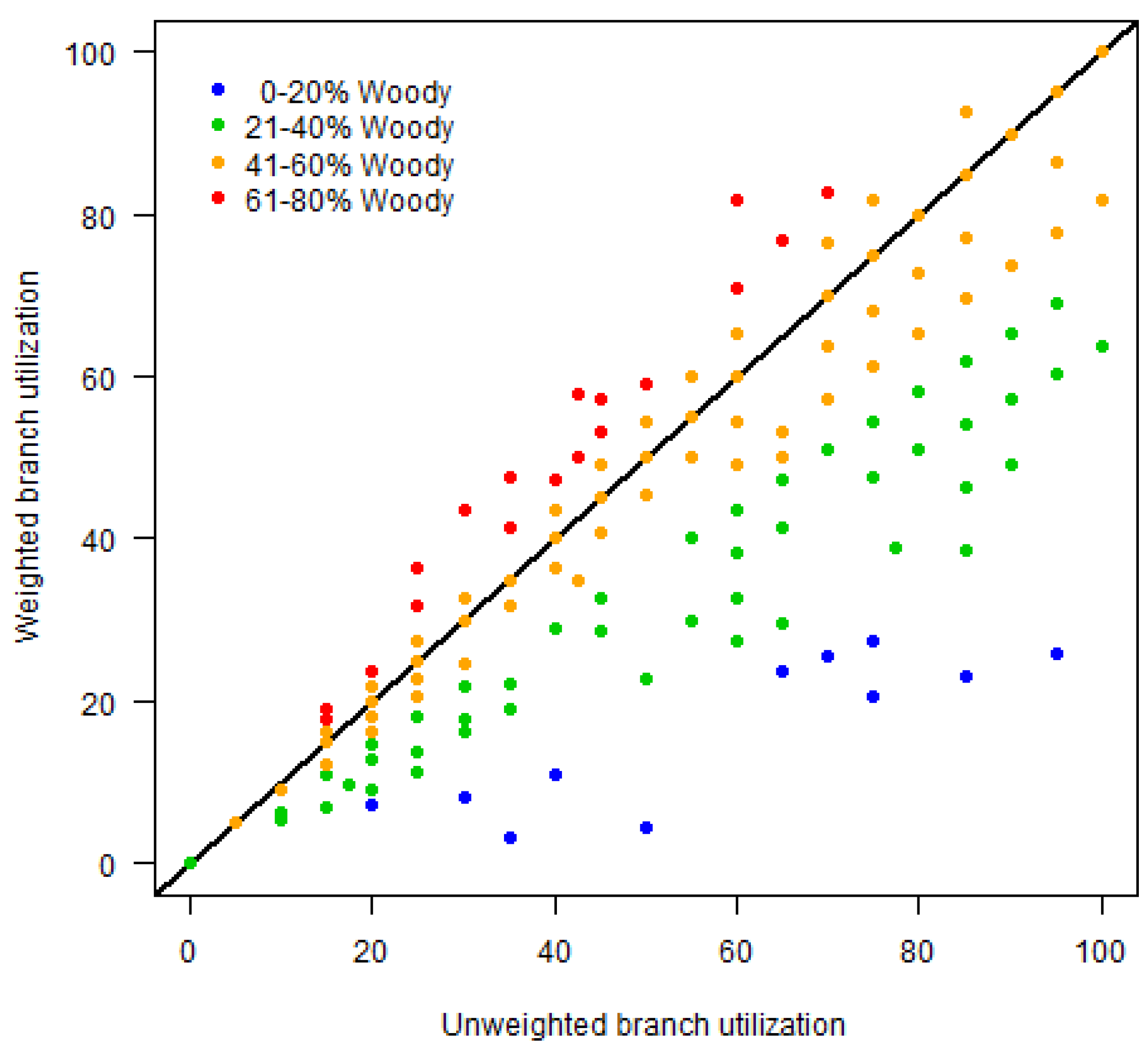 Relationship between unweighted and weighted measures of elephant utilization along the Chobe riverfront, Botswana. The 1:1 line is indicated in black for comparison. The weighted utilization measure penalizes the values of plots with few trees (blue and green), shifting them below the 1:1 line, and emphasizes those with higher woody cover (red), shifting them above the line. See text for details.