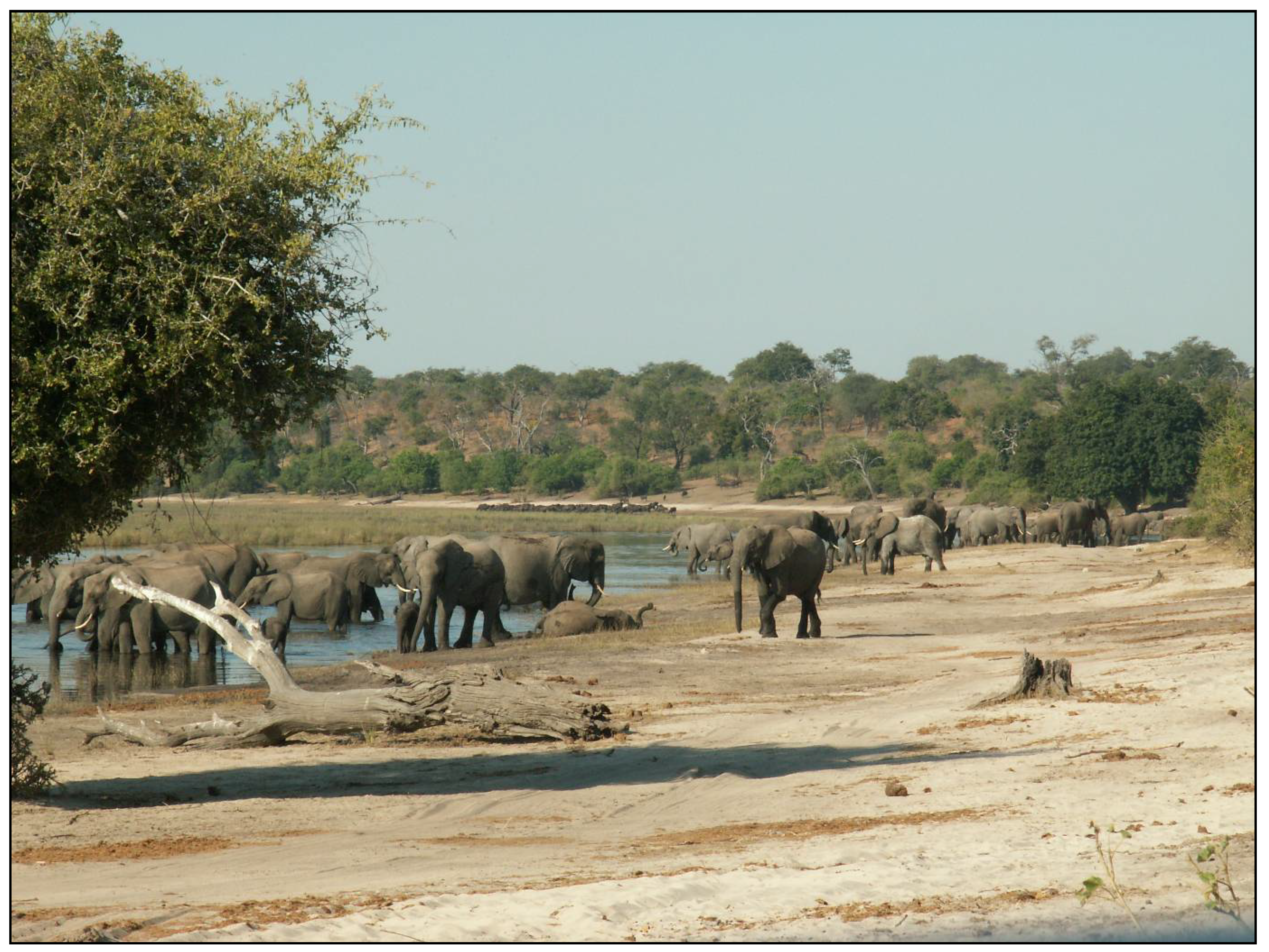 Chobe is home to a wide variety of wildlife, including 38 species of large mammals weighing more than 7 kg [71]. It also is inhabited by abundant bird species and provides a refuge for many birds of prey [72]. Chobe is most famously known, however, for its elephant population. Currently, northern Botswana has between 120,000–150,000 individuals, forming the largest population on the continent [29]. Chobe contains more elephants than any other protected area in Botswana with over 40,000 animals [29]. While elephant numbers are high within the park, densities in specific areas vary seasonally. Elephants concentrate along the Chobe riverfront in the dry season, resulting in local densities around 4 animals per km2, and then disperse southwards in the wet season as temporary pans fill with water, reducing riverfront densities to around 0.5 animals per km2 [73]. Concerns about the impacts of increasing numbers of elephants in Chobe on vegetation and wildlife have been voiced for the past 40 years [71] and have prompted a number of studies into the influences of elephants in this system [35,40,64,65,74]. Studies have shown dramatic changes in vegetation along the riverfront due to elephant impacts [64]. These effects are compounded by those of other large herbivores, which may prevent affected vegetation from regenerating [74,75].