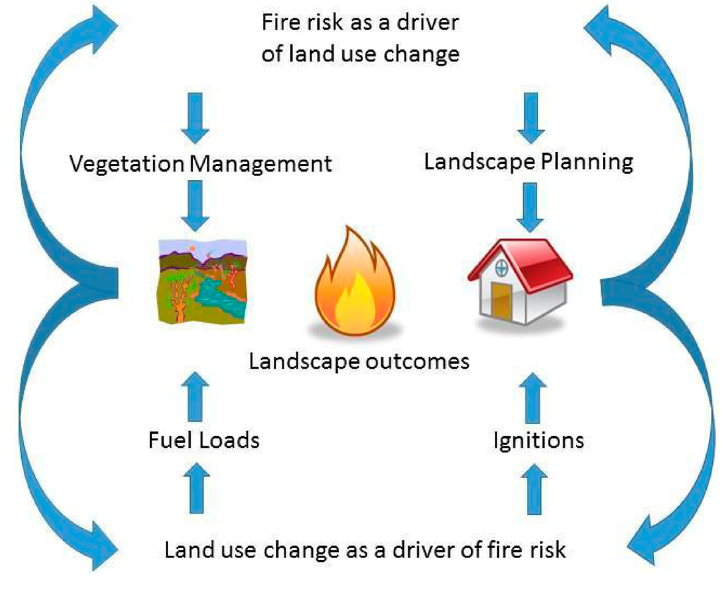 We believe that a land systems science framework for understanding the complex role of fire in society may be a valuable contribution to our understanding of human fire relationships. This is urgently needed, especially given the important role that land use plays in different fire-related problems across the globe [20]. Here, we attempt to synthesize the relationships between fire, its risk, and management, and land use change. We start by reviewing past research on the impacts of fire, fire risk and fire management on land use change as well as the impacts of land use change on fire ignitions and fuel loads. We will then offer a land change science perspective on fire and land use interactions drawing heavily on the idea of land use teleconnections [18]. In this section we focus on a short case study of teleconnections between land use and fire, fire risk, and fire management in California. Our goal is to demonstrate how a land change science perspective can broaden the suite of interactions that are evaluated within the land change/fire system. The inclusion of teleconnections within this system suggests the need to coordinate land change and fire management across large spatial scales and between non-adjacent areas.