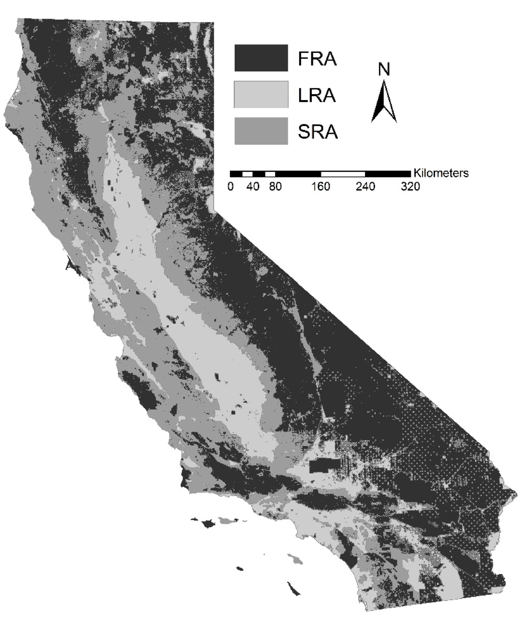 - Calfire, SRA, LRA, and FRA Data. Available online: http://frap.cdf.ca.gov/data/frapgisdata-subset.php (accessed on 24 February 2015).