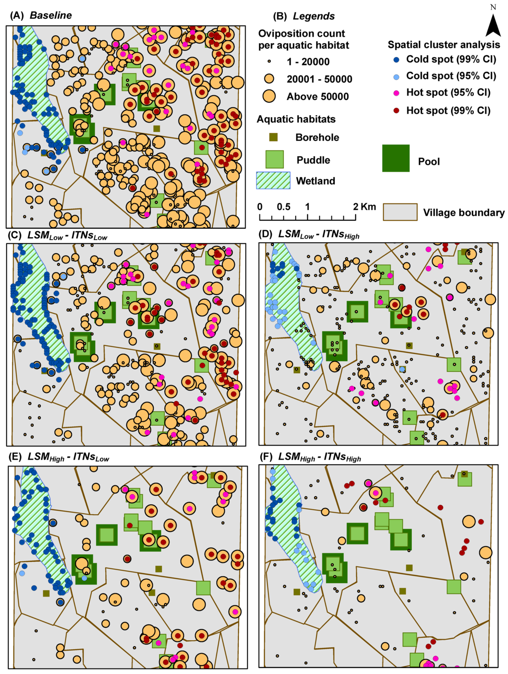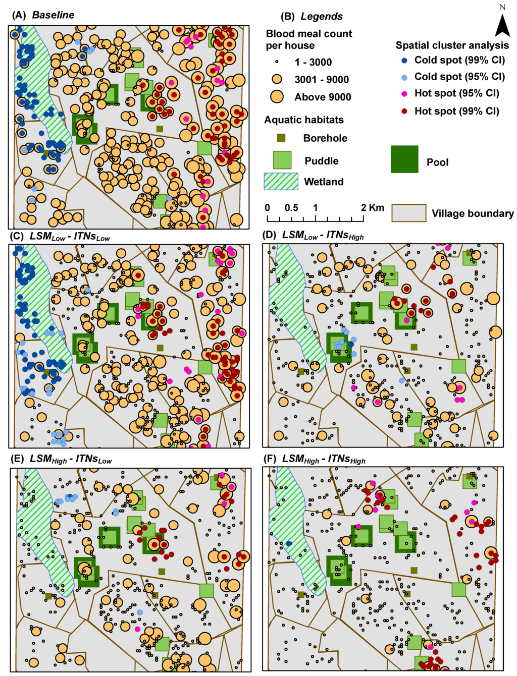 Figure 4B, both the eastern portion of the south-west quadrant and most of the eastern edge of the wetlands portray two house clusters with very few or no aquatic habitats (including pit latrines) in the vicinity. As a consequence, these areas contain almost no hot spots, as depicted in the hot spot analysis results (see