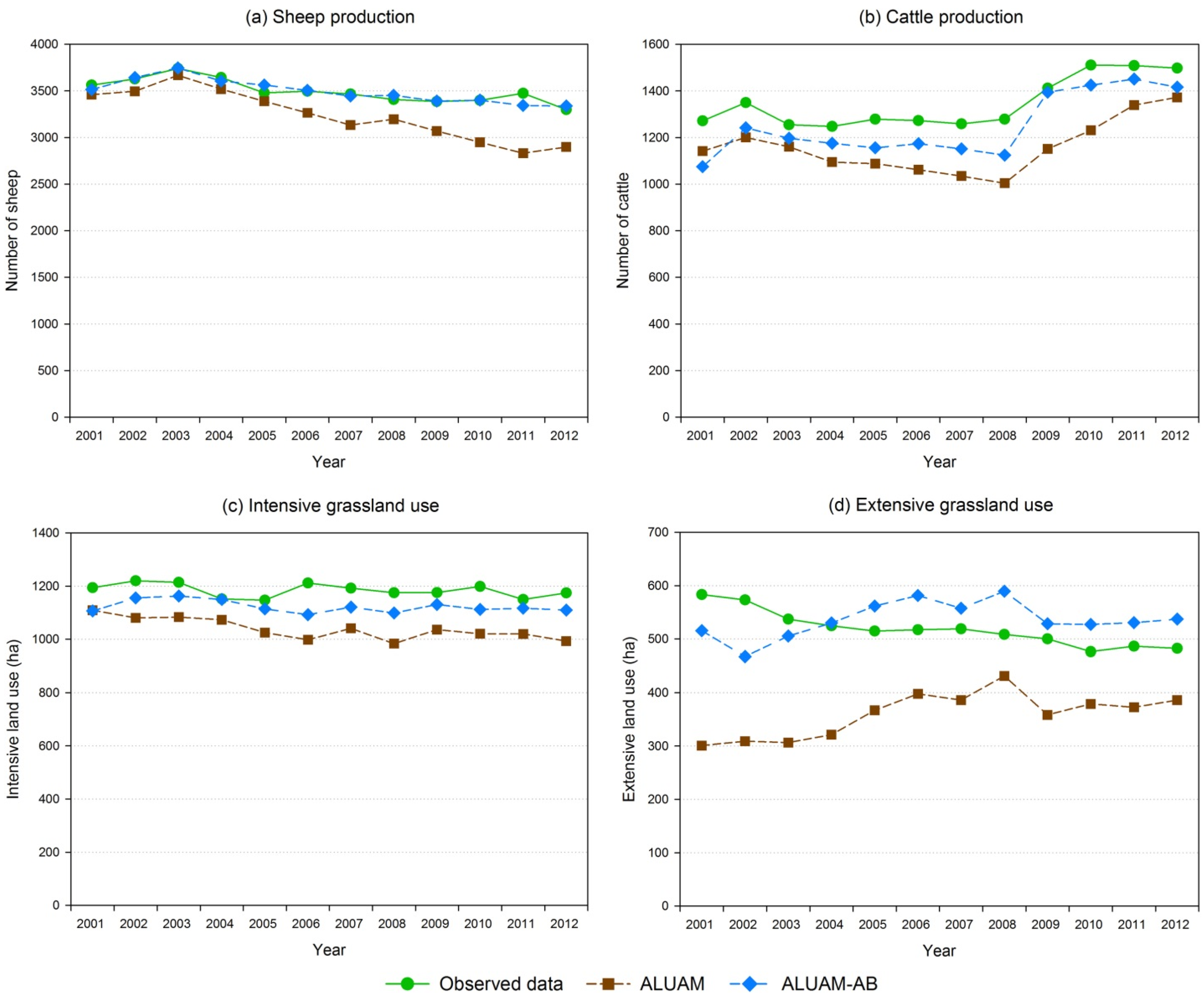 For model calibration, we use census data from the Federal Office of Agriculture containing livestock housing capacities and numbers of farms as well as managed land, farmer age, livestock numbers and land in slope categories for each farm type in the year 2000 [78]. Model validation uses the development in exogenous input parameters, i.e., prices, costs and direct payments between the years 2001 and 2012 to test model behavior (see Table B1 in Appendix). The modeling results with respect to the number of animals (cattle and sheep) and land-use intensities (area of intensive and extensive land-uses) are then compared to the development of these parameters in the census data to assess the single best performance of the model (validation). To compare the different grazing animals, we use livestock units (LU) which represents a nutritional equivalent between sheep (0.17 LU), dairy cows (1 LU), suckler cows (0.8 LU), calves and heifers (0.4 LU). The total area of extensive grassland and total areas of intensive land-uses serve as indicators for land-use intensities. Extensive land-use covers the land-uses entitled to ecological compensation payments in Switzerland, namely extensively managed hay meadows, less intensively managed meadows and extensive pastures. Extensively managed meadows and pastures can only be cut or grazed after the 15th of July. Only two cuts or grazing rotations are permitted and no fertilizers are allowed on meadows.