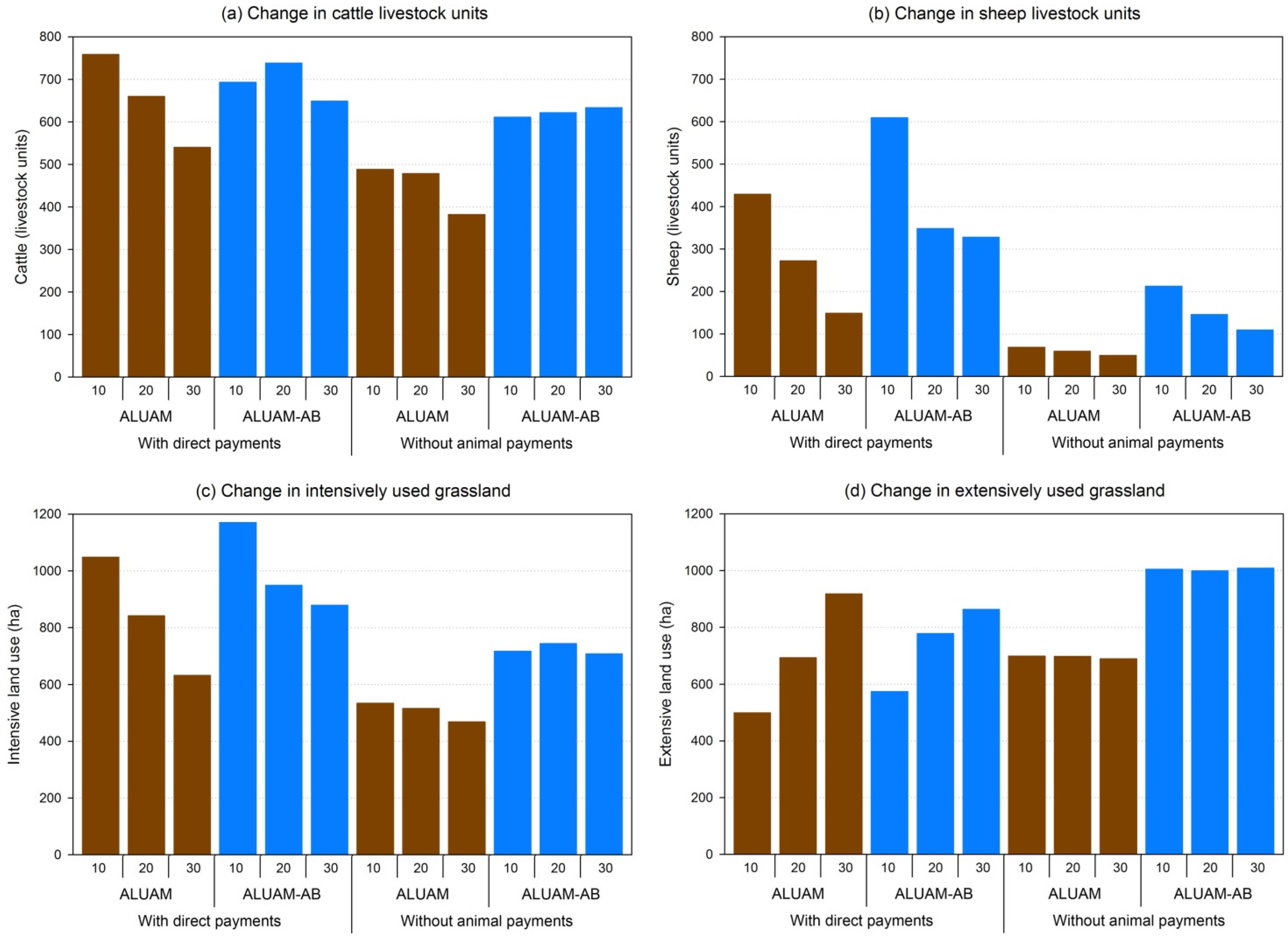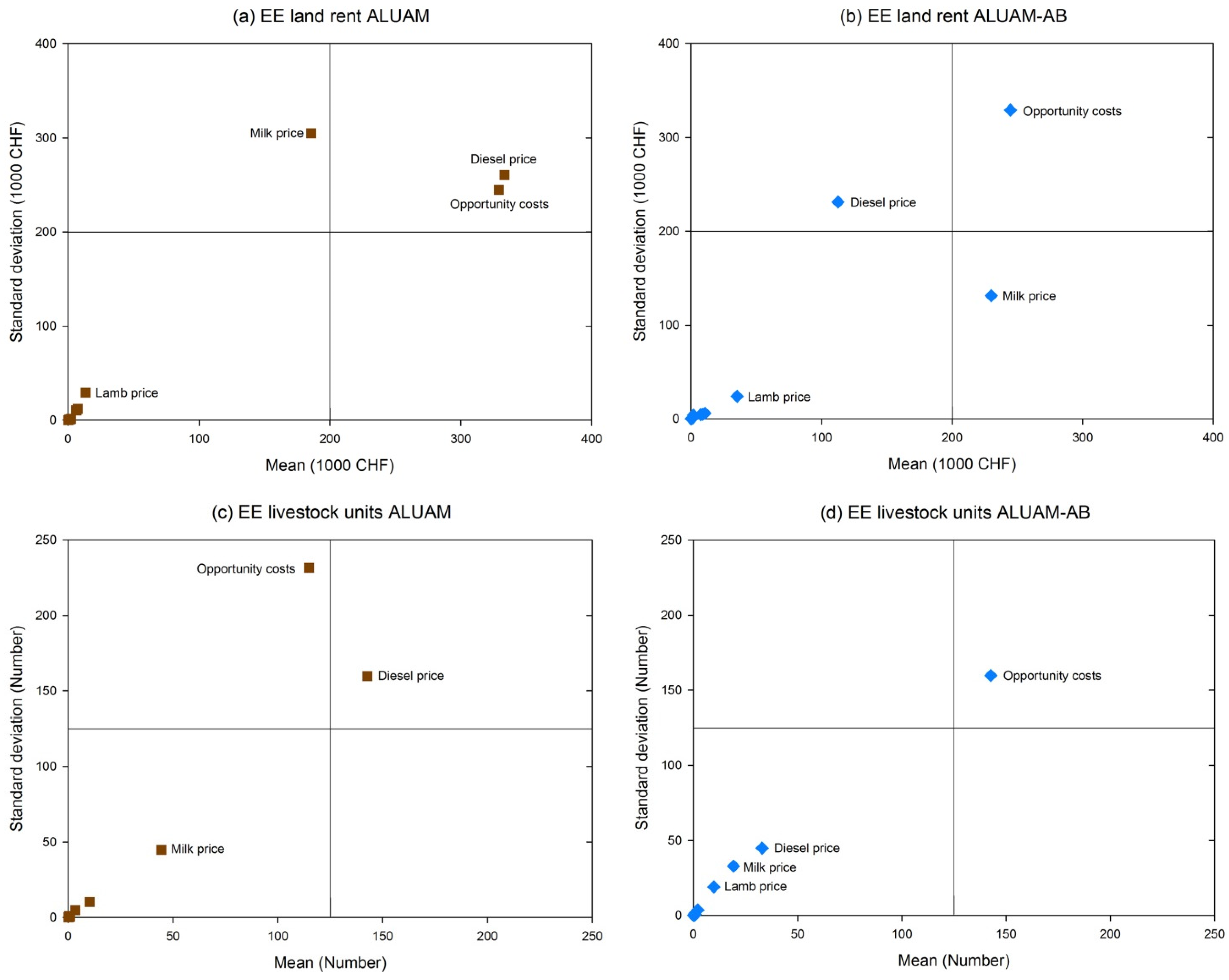 We calculate the EE for the aggregated land rent, i.e., the objective function of ALUAM, and of the agents in ALUAM AB four the exogenous parameters presented in Table 1, i.e., prices, costs, direct payments and agent characteristics. In addition, we also provide the EE for the number of animals since this output is highly correlated to ecosystem services provision in our case study region [49].