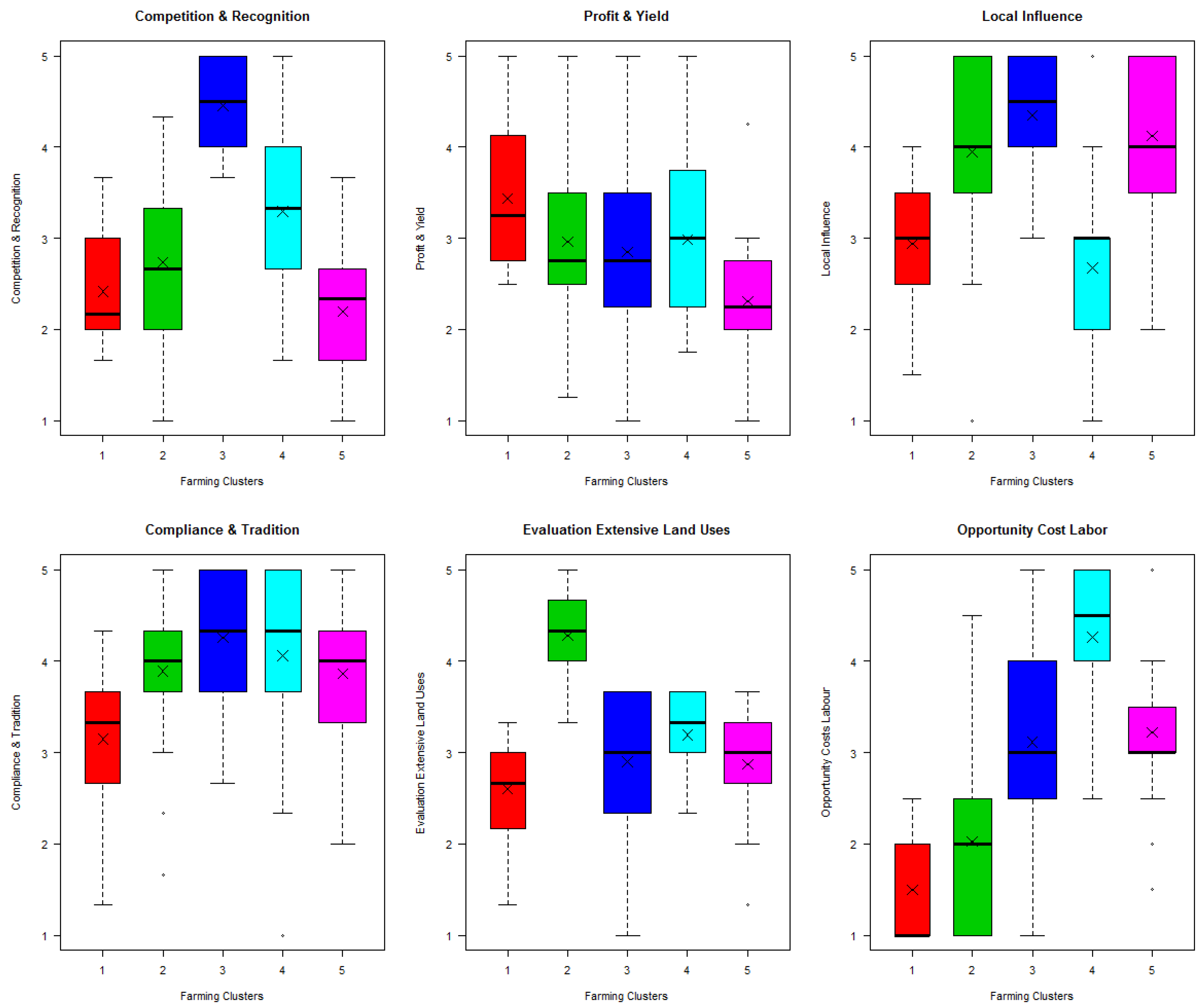 | Production-Oriented Farmers (n = 16) | Ecological and Landscape Stewards (n = 19) | Part-Time/Leisure-Oriented Breeders (n = 30) | Traditionalist Leisure Farmers (n = 17) | Leisure-Oriented Farmers (n = 29) | ||