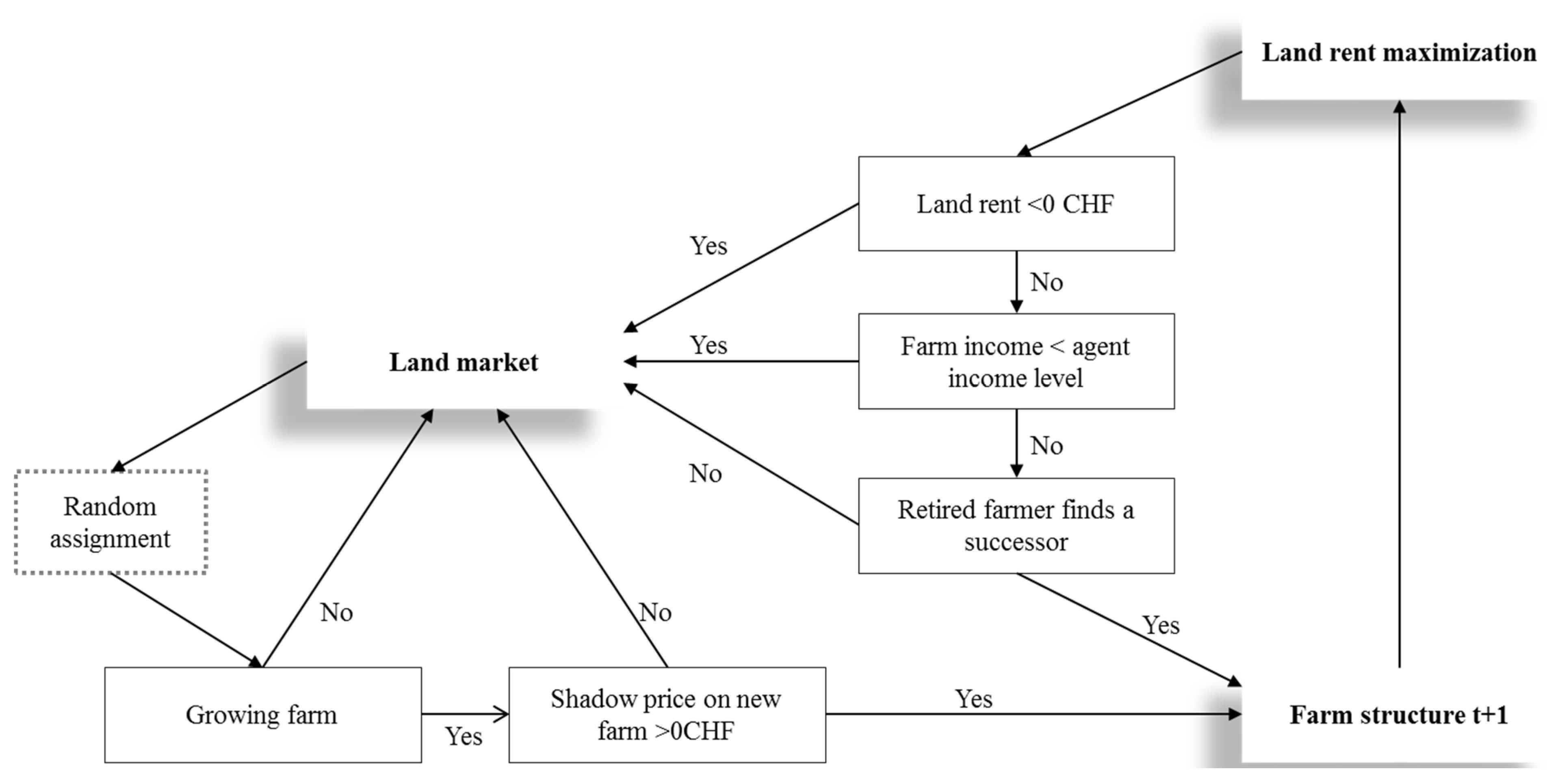 Structural change is modeled using a land market sub-model [45,61]. The model identifies land units that are no longer cultivated under the existing farm structure. There are three reasons why fields are attributed to the land market in the model (see Figure B1 in the Appendix): (i) units generate a land rent below zero, (ii) the corresponding agent does not reach the minimum wage level, therefore the farm is abandoned and all the assigned land enters the land market or (iii) the farmer retires in the simulation year and has no successor. The land market sub-model randomly assigns the land units to one of the other agents. It is then checked to confirm that this agent shows the two following characteristics: The agent receiving the land unit must want to expand his cultivated area (stated willingness to grow) and his shadow price for the land unit must be positive. If these conditions are not met, the land unit is returned to the land market and assigned randomly to another farm. Once again it is checked to verify that this agent fulfils the conditions for the assignment of land. This procedure is repeated until all land units are assigned to a farm or none of the farms is willing to take the land units left on the market. Land units that are not transferred to other farms are defined as abandoned and natural vegetation dynamics get under way on these units (modeled in LandClim). If land-use allocation is optimal, farmland capacities and livestock are updated and the next annual time step is initialized using the parameters (prices, costs) of the following year.