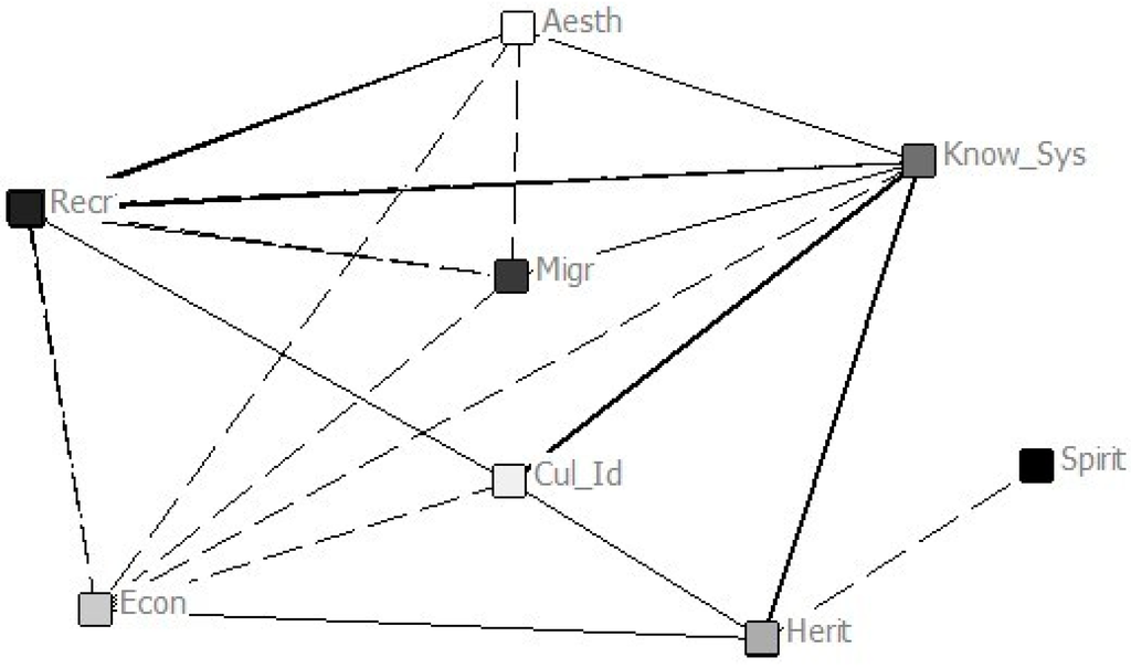 Regarding the interrelations between the different CESs (represented in Figure 7), there are tradeoffs between increasing recreation leading to a decreasing cultural identity, heritage and spiritual values. Another interrelation is that a decline of heritage values and cultural identity leads to a decline of spiritual values, and the reverse, as the three are strongly interrelated. This implies some overlapping, of which we are aware. It is due to the fact that considering the nature of CESs, there are strong interdependencies which until now have been little investigated, as CESs mostly have been evaluated separately. By analysing and showing the importance of these interrelations, however, we also hope to be able to draw some conclusions about how important they are separately. It must be stressed here again that the purpose of the assessment is not to quantify the CESs but to demonstrate their importance by analysing their interdependencies and to understand the level of their local perception. This is also why the problem of double-counting should not be relevant in this study. Future investigations, however, which aim at quantifying CESs should keep this double-counting in mind. It could also be an interesting starting point for future studies to analyse how much overlapping we face in CES studies.