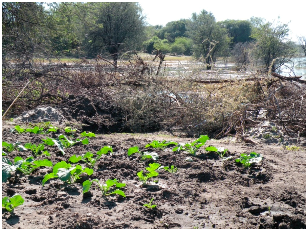 Given the dynamic environmental conditions of the Okavango Delta, livelihood systems are either tightly calibrated to these biophysical dynamics or forced to make adjustments in response to biophysical variability [36]. One study of five villages located throughout the Delta found that households participate in an average of three livelihood activities [33]. One agricultural practice in the region is molapo (floodplain) farming (Figure 2), which is a traditional form of agriculture dating back at least several hundred years and that takes advantage of the unique flooding dynamics of the Delta [37]. As the floodwaters recede at the end of the wet season (roughly around August-September, though this varies spatially and temporally), molapo farmers plant seeds in the relatively nutrient-rich, moist soil left behind by the waters [37]. Molapo soils are preferred by some residents to those in the dryland outside of the floodplain because they are seen as more fertile and they depend less on variable precipitation patterns because of their proximity to water. Maize, a staple grain in the region, is grown in nearly all molapo fields, along with beans, melons, squash, and sorghum [37]. There is risk associated with molapo farming due to crop loss resulting from years of high levels of flooding, insecure land tenure, and damage from livestock and wild animals. When damage to molapo fields occurs, residents in some regions switch to dryland farming, while people in other areas prefer to try to continue to molapo farm [34].