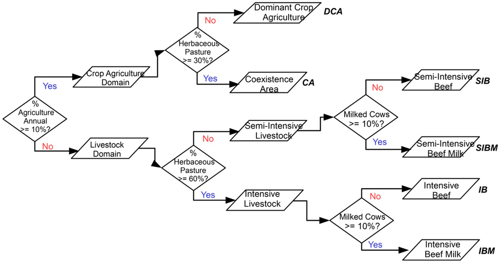 We successfully identified various metrics and values to be used as separation criteria in the decision tree. The main criterion branch was based on the land cover of annual crops and livestock rearing. Municipalities with annual crop land cover values above or equal to 10% were classified as belonging to the crop agriculture domain; below this figure they were classified as belonging to the livestock domain. These two domains were then further subdivided.