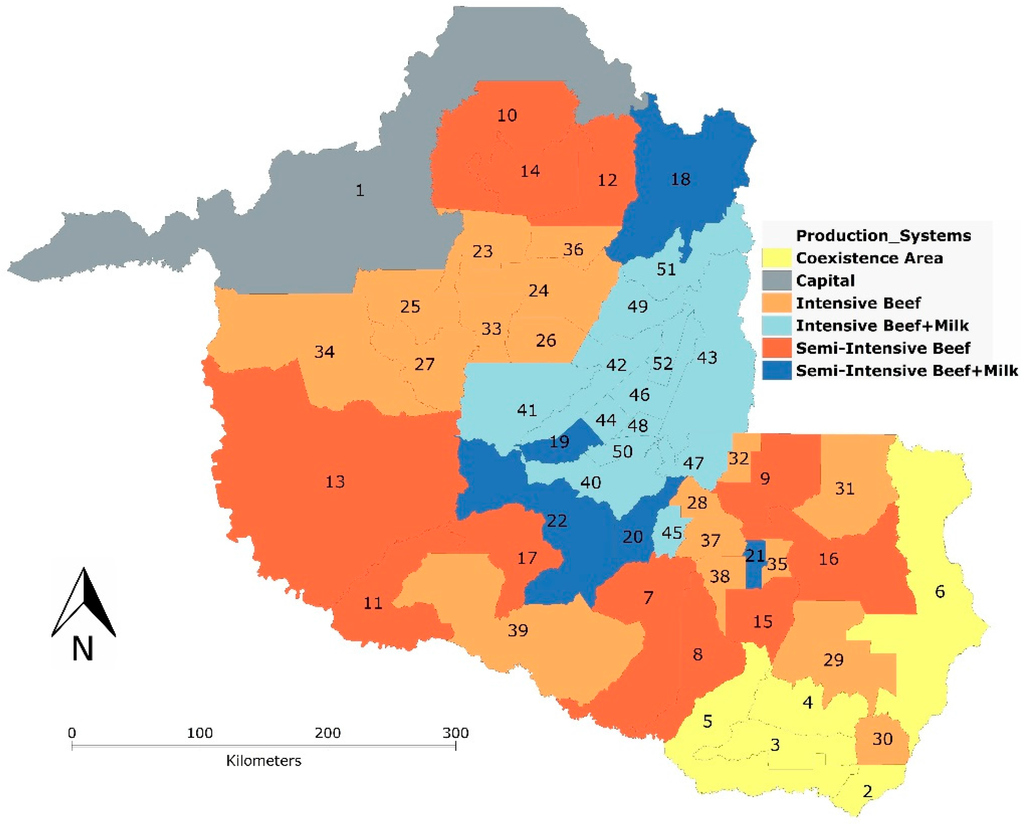 The livestock domain was subdivided based on presence of more than 60% of “clean” pasture. Municipalities meeting this criterion were characterized as intensive livestock farming. Municipalities with less than 60% of “clean” pasture were classified as semi-intensive livestock farming.