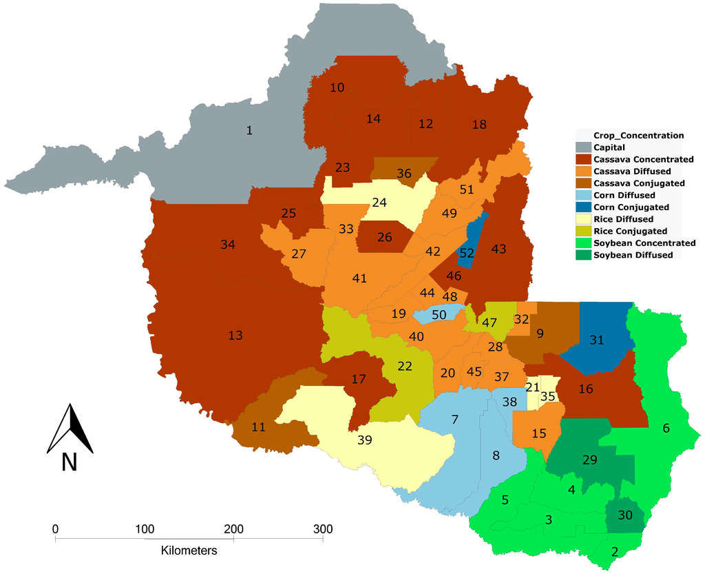 Following the methodology described in Section 3.2.1, the degree of concentration of the main five crops’ production was identified (Table 2; Figure 3). In total, 18 municipalities were classified as “concentrated,” 7 as “conjugated,” and 26 as “diffused.” “Concentrated” municipalities were mainly located near state boundaries, while soybean (7 municipalities) and corn (6 municipalities) were mainly in the south of the state of respectively, corroborating both the literature [] and land use data from the TerraClass project []. Cassava predominated in all regions of the state, except for the south, and was the main crop in 32 municipalities. Table A2 in the appended material shows the proportional economic contribution of the five major crops for each municipality.