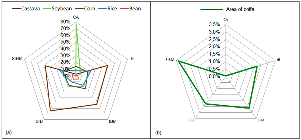 As with cassava, coffee cultivation predominated in cattle-based production systems (Figure 4), and only 0.04% of the area of municipalities was dominated by coexistence agriculture (CA). The area occupied by coffee was slightly higher in production systems that involve a substantial element of milk production (IBM and SIBM), perhaps indicating a greater compatibility in the production of these basic agricultural products.