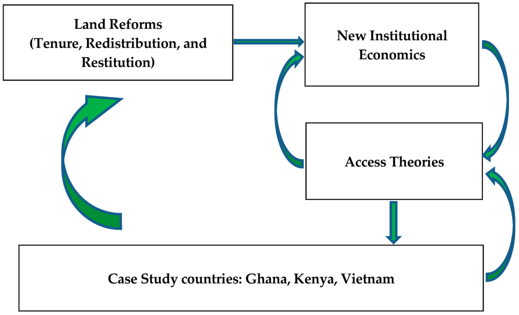 The discussions in this paper employ a composite of the New Institutional Economics (NIE) and Access Theory as the analytical framework for the study. In using this framework, the authors try to interrogate land reform in terms of how it affects costs of agricultural investments and the ease of access to land and credit. Following Ribot and Peluso [11], access in this context refers not only to property rights but also to “the ability to benefit from things”. Figure 1 shows the connections of the two major theoretical approaches applied in this study, that is, NIE and Access Theory and their linkages with land reforms.
