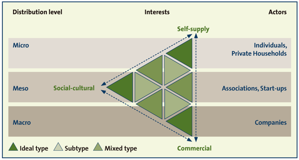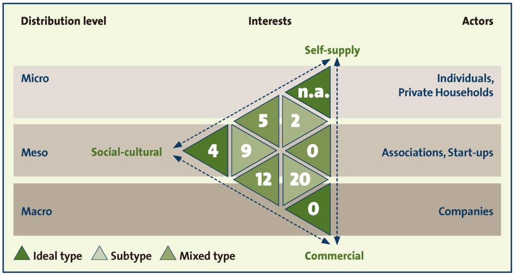 All types were assessed as relevant by the stakeholders. The existence of different types and of transitions between them was confirmed by observation and experience, e.g., that socially motivated people move from cooperation in community gardens to allotment gardens and hence contribute to changing the primary self-supply orientation of this gardening type.