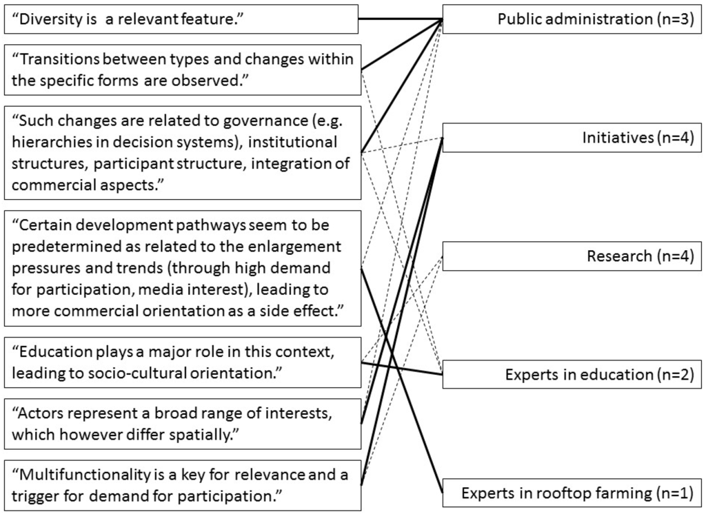 The latter was discussed with stakeholders from UA practice, associations, public administration and research in Berlin. To qualify this, here the non-representativeness and limited number of participants (n = 14) should also be noted. Since all stakeholder came from Berlin, we cannot make statements about the perception in other urban areas. Discussions with stakeholders strengthen the assumption that the typology is useful in identifying different groups of UA initiatives and in clarifying the field of UA with its huge diversity. A lesson learnt from the stakeholder workshop is that the typology can be more than an instrument that facilitates grouping or understanding. It can be seen as tool for guiding discussions towards clarifying roles. Limited is its feasibility as a direct support for daily work processes of those who take decisions related to different forms of UA and their requirements; the developers of the typology had initially assumed that this would be an application. In the workshop the stakeholders highlight the high commitment towards ensuring diversity as a major strategy and reject the usability of the typology for influencing spatial or group targeted priority setting in planning, decision and policy making. We nevertheless recommend that the typology should be tested in a practical context for discussion and profiling purposes. One reservation towards applying the typology as a planning tool was seen in the risk of it leading to a standardization of requirements (e.g., priority for access to gardening spaces) and development pathways that are on a second level agenda, e.g., towards commercialization. The system boundaries (as described above) had been introduced and accepted by the stakeholders. However, one criticism is that the categorization lacks definition and accuracy, particularly with regards to its grounding in economic theory, which might not take the sharing economy into account, which is at least part of the theoretical pillars of the bottom-up and transition movements that UA advocates perceive themselves to be part of. System boundaries also fail to refer to urban-rural interactions, such as the positive impacts of UA on rural viability.