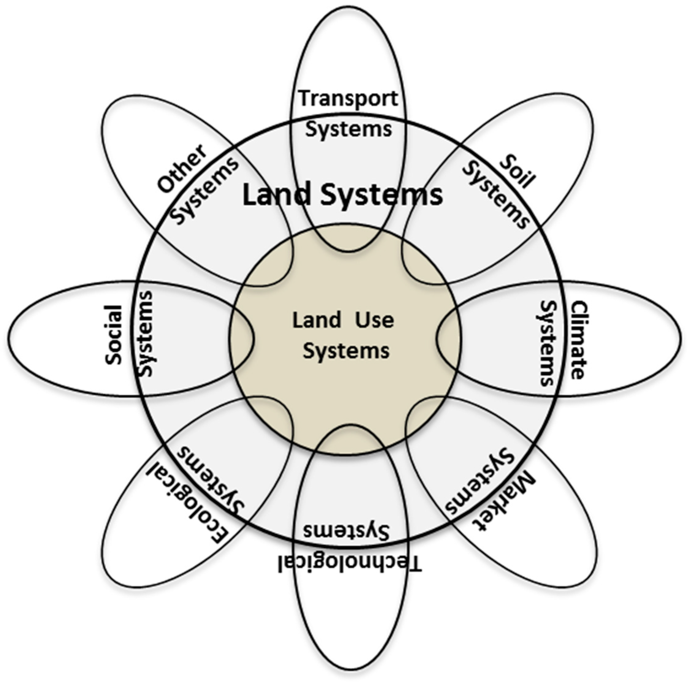 Land systems. At the centre of a land system is the land use system. Interacting with the land use system are the related systems: their dynamics are strongly coupled with dynamics in the land use system. Land systems encompass the land use system and parts of these related systems. These related systems can interact with each other, and may overlap (for simplicity, not reflected here). A feedback within a land system is a situation in which the land use system and a related system are connected together in such a way that they influence each other and their dynamics are thus strongly coupled (based on Aström and Murray [6]).