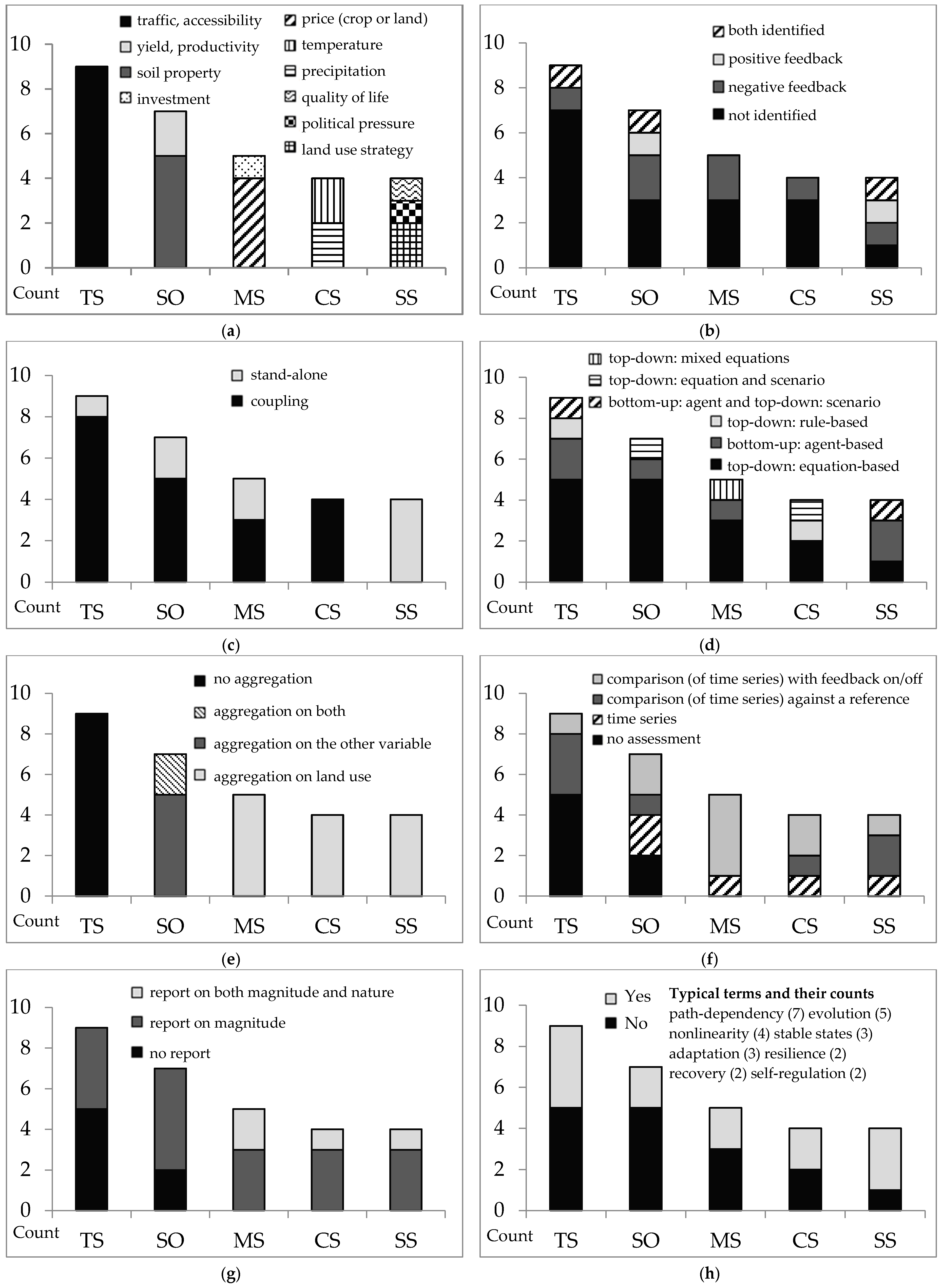 (a–h). Representation of feedbacks in the reviewed models, according to the related systems addressed. Note (1) TS: transport system, SO: soil system, MS: market system, CS: climate system, and SS: social system; (2) Cases that discussed feedbacks only conceptually without implementing them in a computational model are omitted. (a) major ‘variables linked’; (b) feedback character; (c) how feedbacks were made operational; (d) modelling techniques; (e) discretisation of space; (f) assessment of feedback effects on the land system; (g) classification of reported land system response; (h) use of complex system terms to describe model outcome.