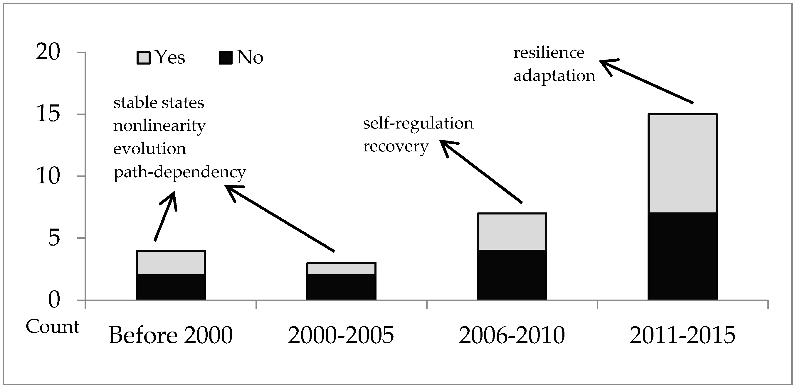 Trend in use of terms related to complex systems to describe land system behaviours. Terms used are connected by arrows to the time period in which their first appearances were found in the reviewed articles.